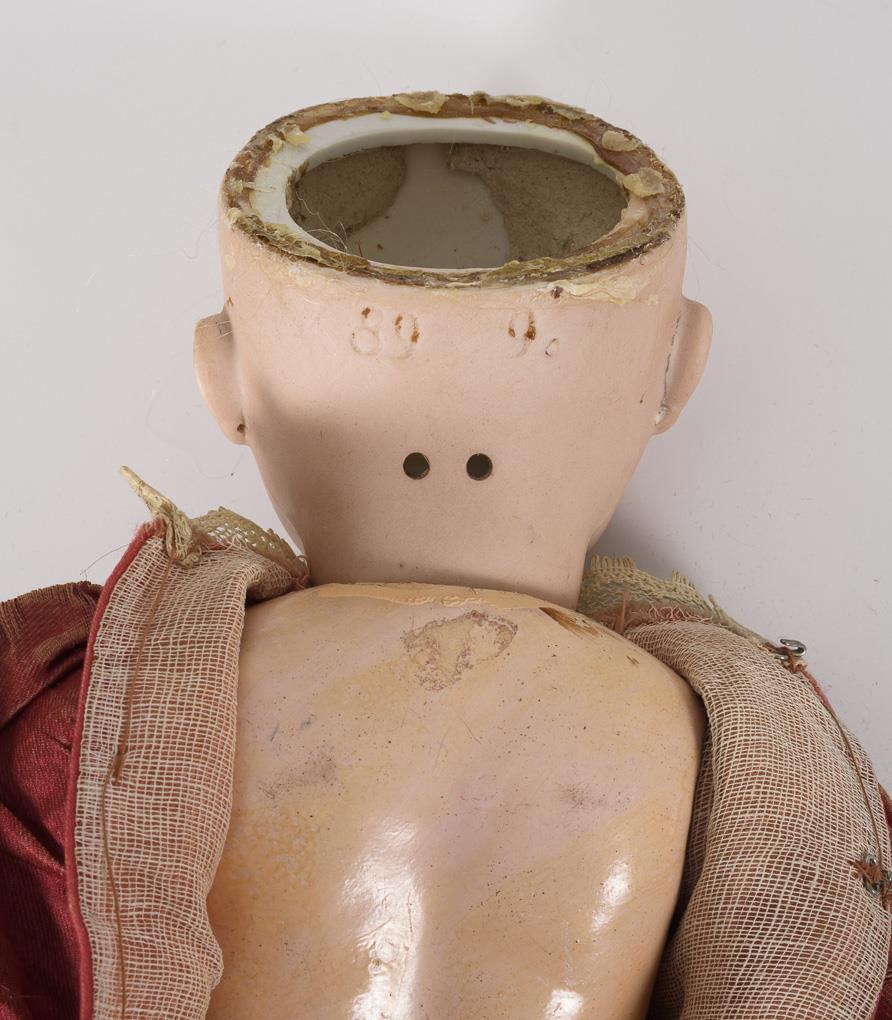 Kurbelkopf, braune Schlafaugen, Ohrlöcher, dunkelbraune Echthaarperücke. 9-teiliger Gliederkörper. Originales hellrotes, plissiertes Seidenkleid, alte Ohrringe, schwarze Schuhe. Am rechten Auge und an den Ohrlöchern je 1 winziger Chip. Körper mit retuschierten Reparaturstellen.