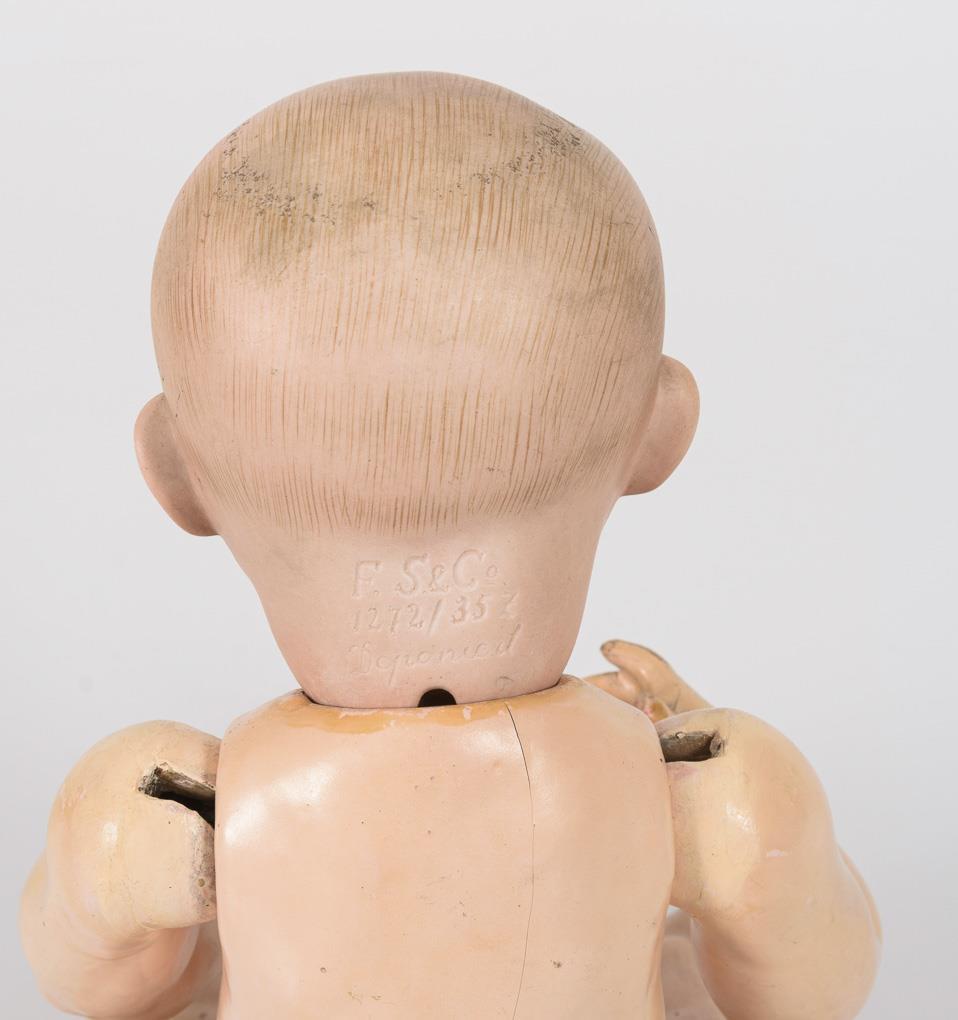 Vollkopf, offene Nasenlöcher, anmodellierte Zähnchen. 5-teiliger Sitzbabykörper. Unbekleidet. Kopf ohne sichtbare Defekte, Augen fehlen. Körper partiell übermalt, Finger bestoßen.