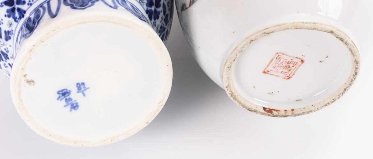 Fast gerade Vase mit weitem Hals, farbige Landschaftsdarstellung. Schriftzeichen am Hals und auf der Rückseite teils berieben. / Mehrfach gegliederte Vase mit kleinteiliger Malerei in Unterglasur-Blau. Glasurschaden am Hals und minimal am Bauch.