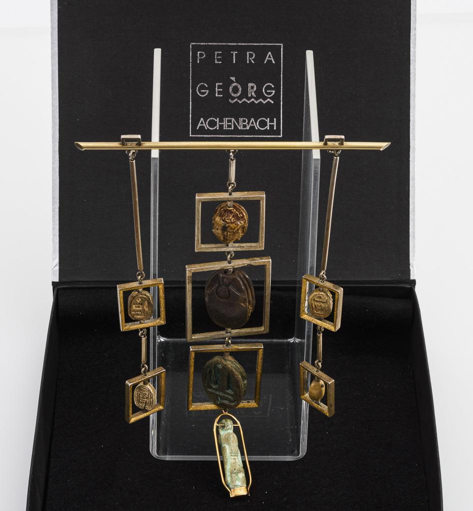 Außergewöhnlicher, großer Anhänger mit antiken Skarabäen und kleiner Plastik, an Halsreif.