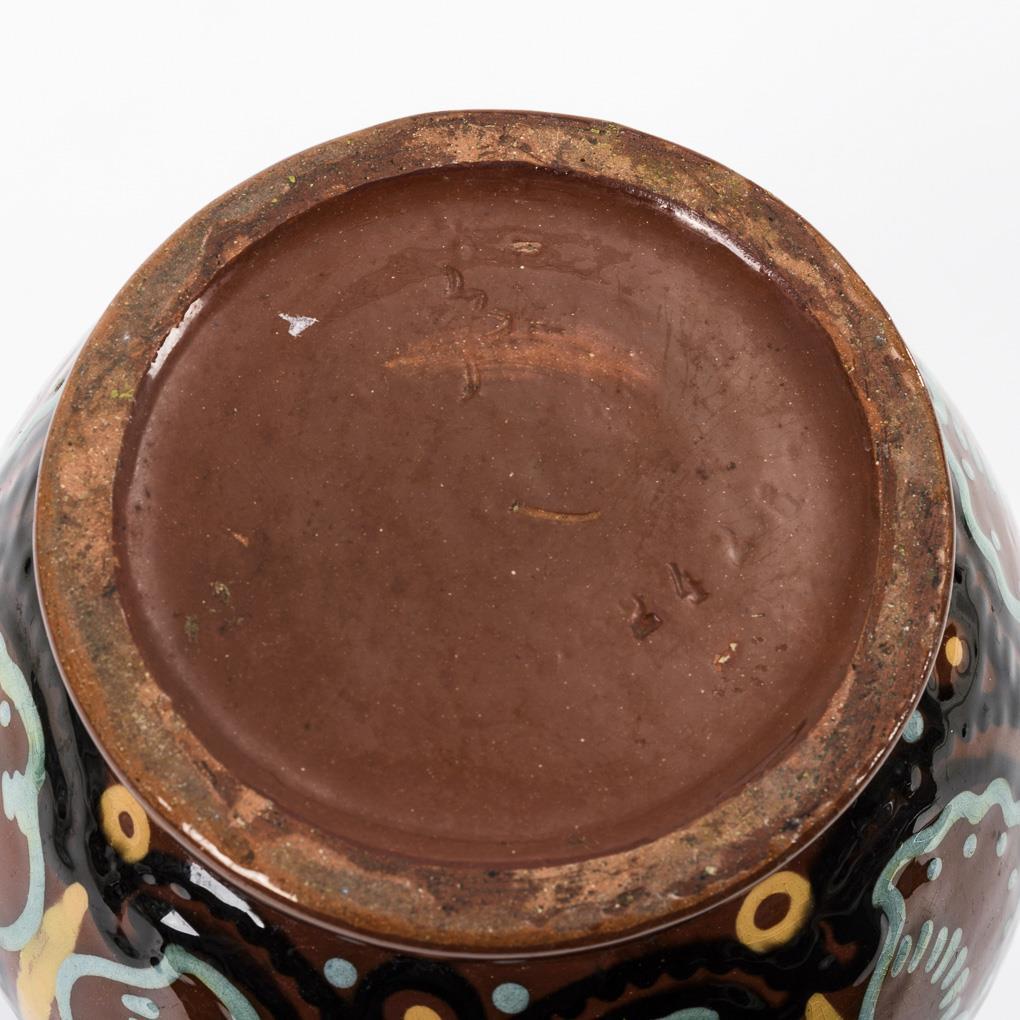 Roter Scherben, rotbraune Engobe, farbige Schlickermalerei, farblose Bleiglasur. H 20,5 cm.