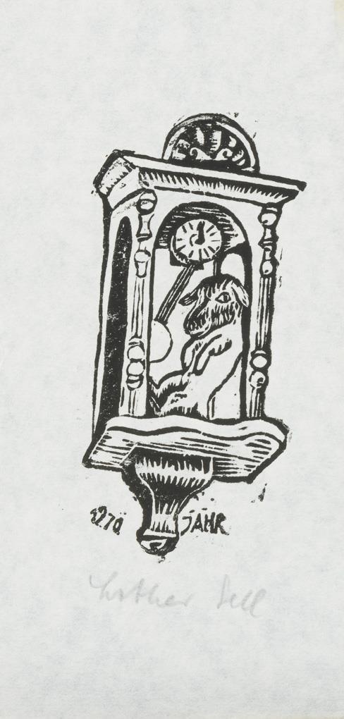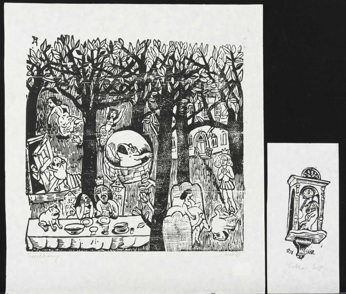 "Froschkönig", [19]70, Stock: 28 x 30 cm, Blatt: 40 x 36 cm und kleinformatiger Holzschnitt, Blatt: 20 x 10 cm als Beigabe in einem Faltblatt anlässlich einer Ausstellung des Erfurter Kunstkabinetts vom 15.4.1973 bis 26.5.1973.