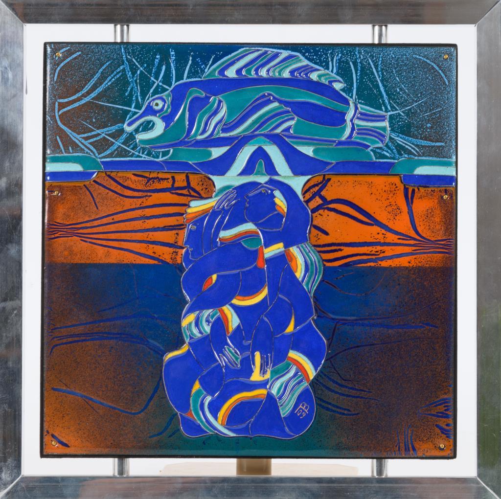 Emailplatte mit Fischen, in silberfarbenem Rahmen.