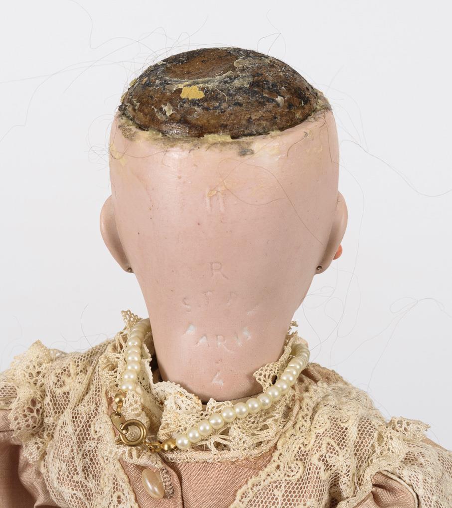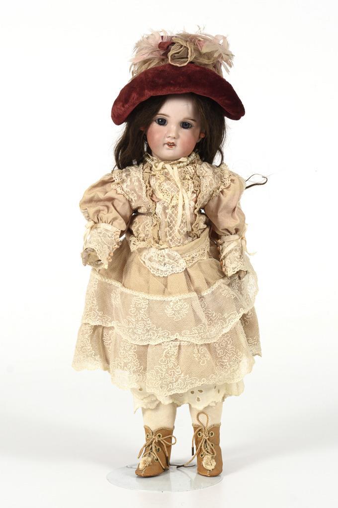 Kurbelkopf, blaue Paperweight-Augen, Zahnreihe, Ohrringe, dunkelbraune Mohairperücke. Einfacher, 5-teiliger Stehpuppenkörper. Rosa Kleid mit Spitzenbesatz, weinroter Samthut, hellbraune Lederschuhe. Kopf durchleuchtet: ohne Defekte, lediglich Kopfkrone unsauber gearbeitet. Linker Arm mit Farbdefekten, Beinansätze durchbohrt (original?).