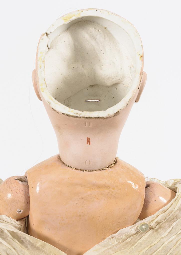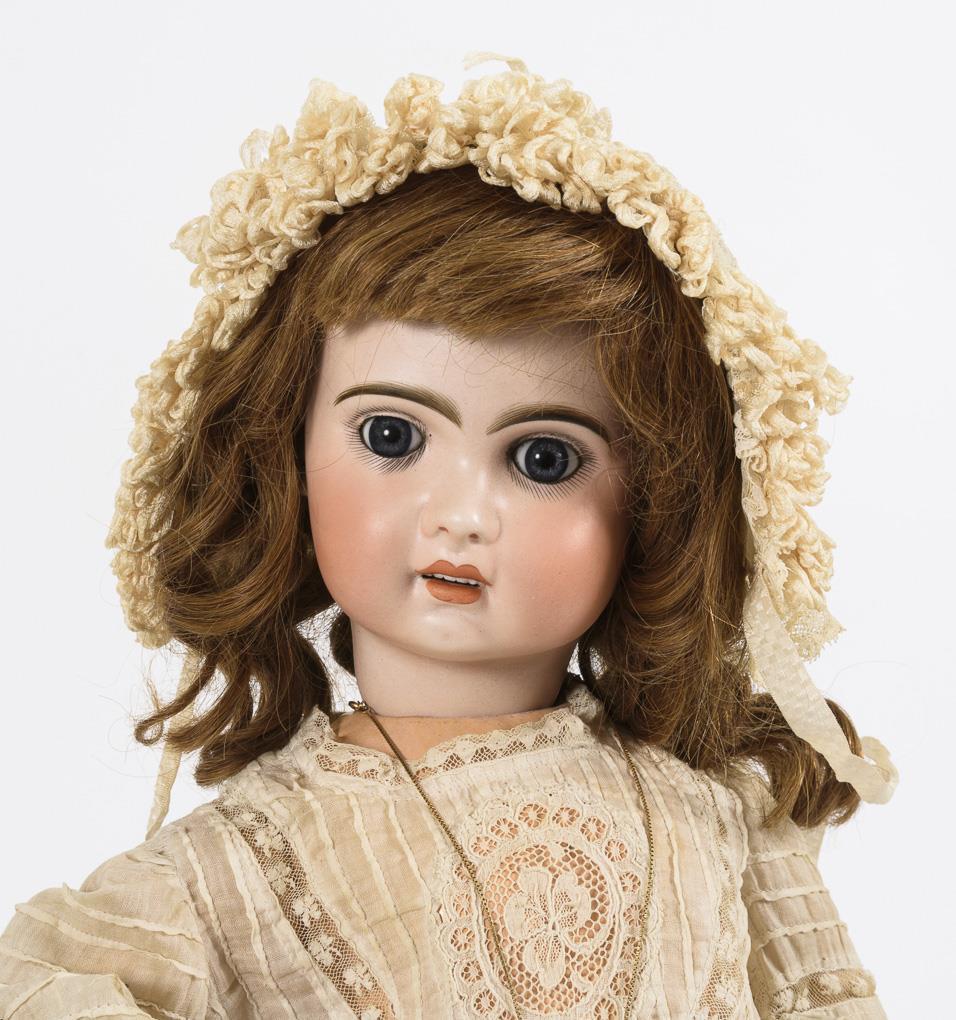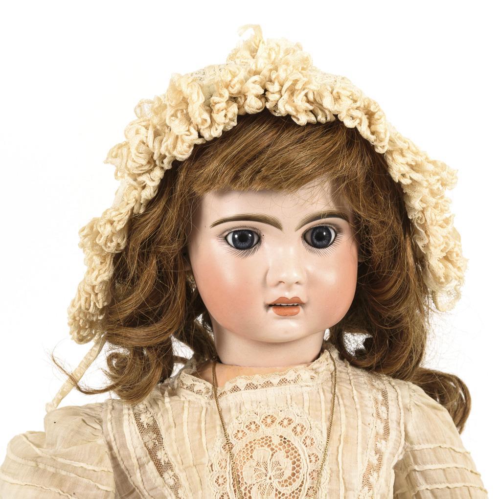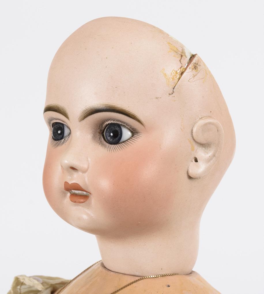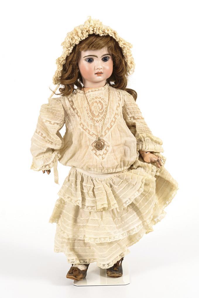 Kurbelkopf, feste blaue Glasaugen, offener Mund mit Zahnreihe, Ohrlöcher, hellbraune Echthaarperücke. 11-teiliger Gliederkörper. Helles Kleid mit Spitzeneinsätzen, passende Haube, alte braune Lederschuhe. 3 cm langer Branddefekt an der linken Schläfe, Körper mit Farbdefekten (vorwiegend an den Händen).