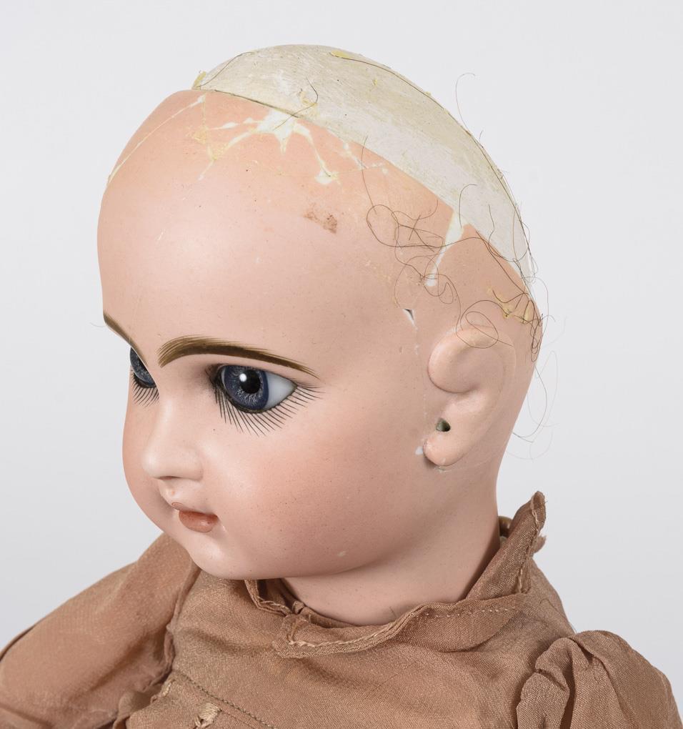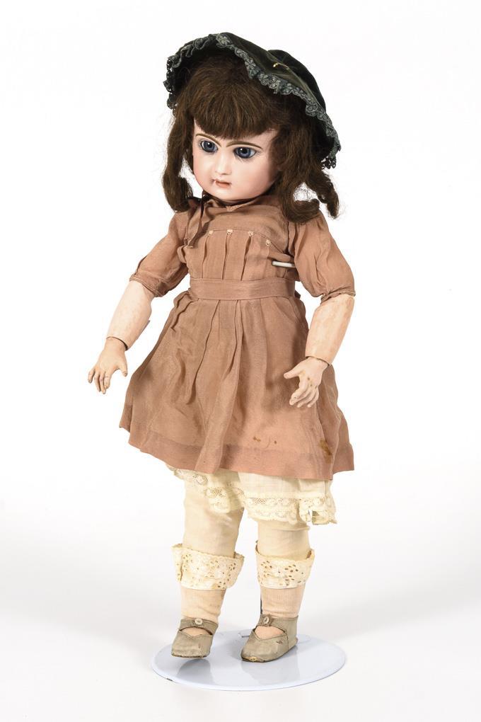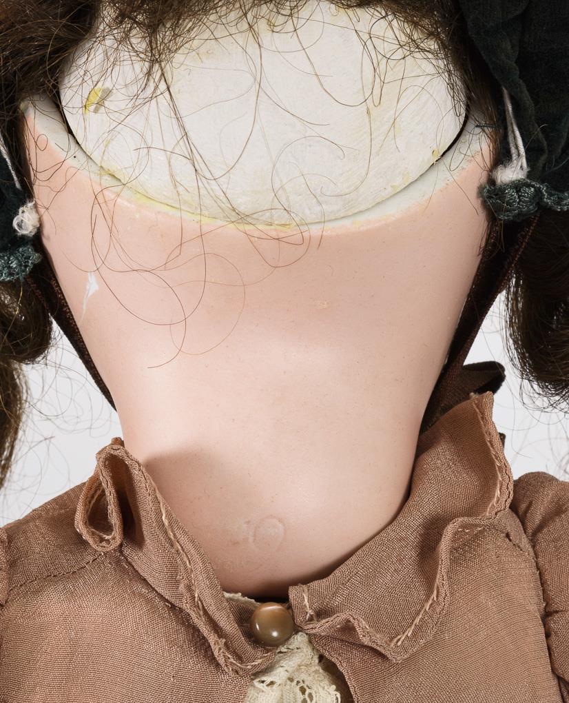 Kurbelkopf, blaue Paperweight-Augen, geschlossener Mund, Ohrlöcher, braune Echthaarperücke. 9-teiliger Gliederkörper mit geraden Beinen. Braunes Kleid, grüne Samthaube, graue Wachstuchschuhe. Kopf geklebt, Unterarme und Hände berieben.
