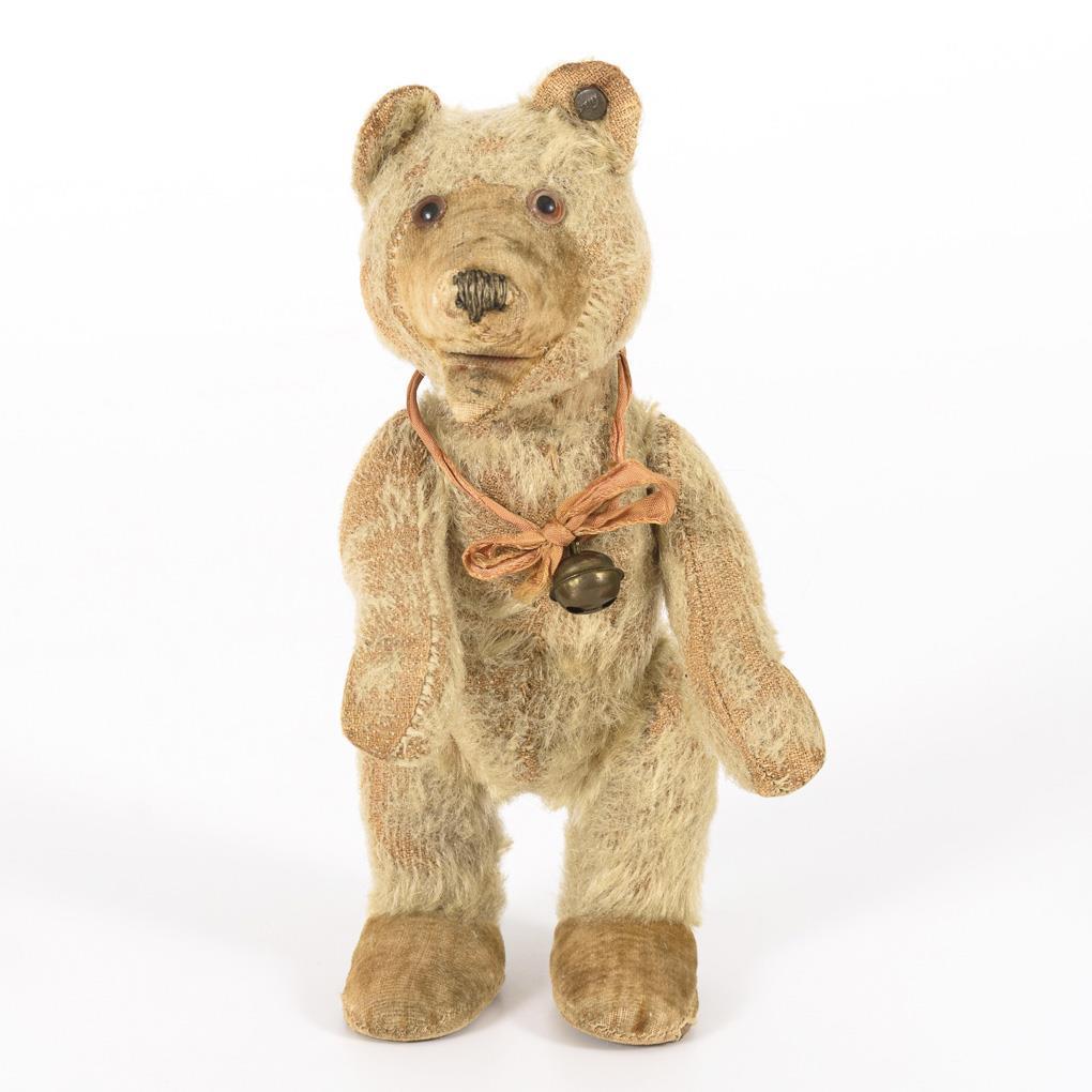 Kleiner Bär mit offenem Maul, Samt-Nase und -Pfoten. Mit Halsschleife und Glöckchen. Abgeliebt, Bauch etwas eingedrückt.