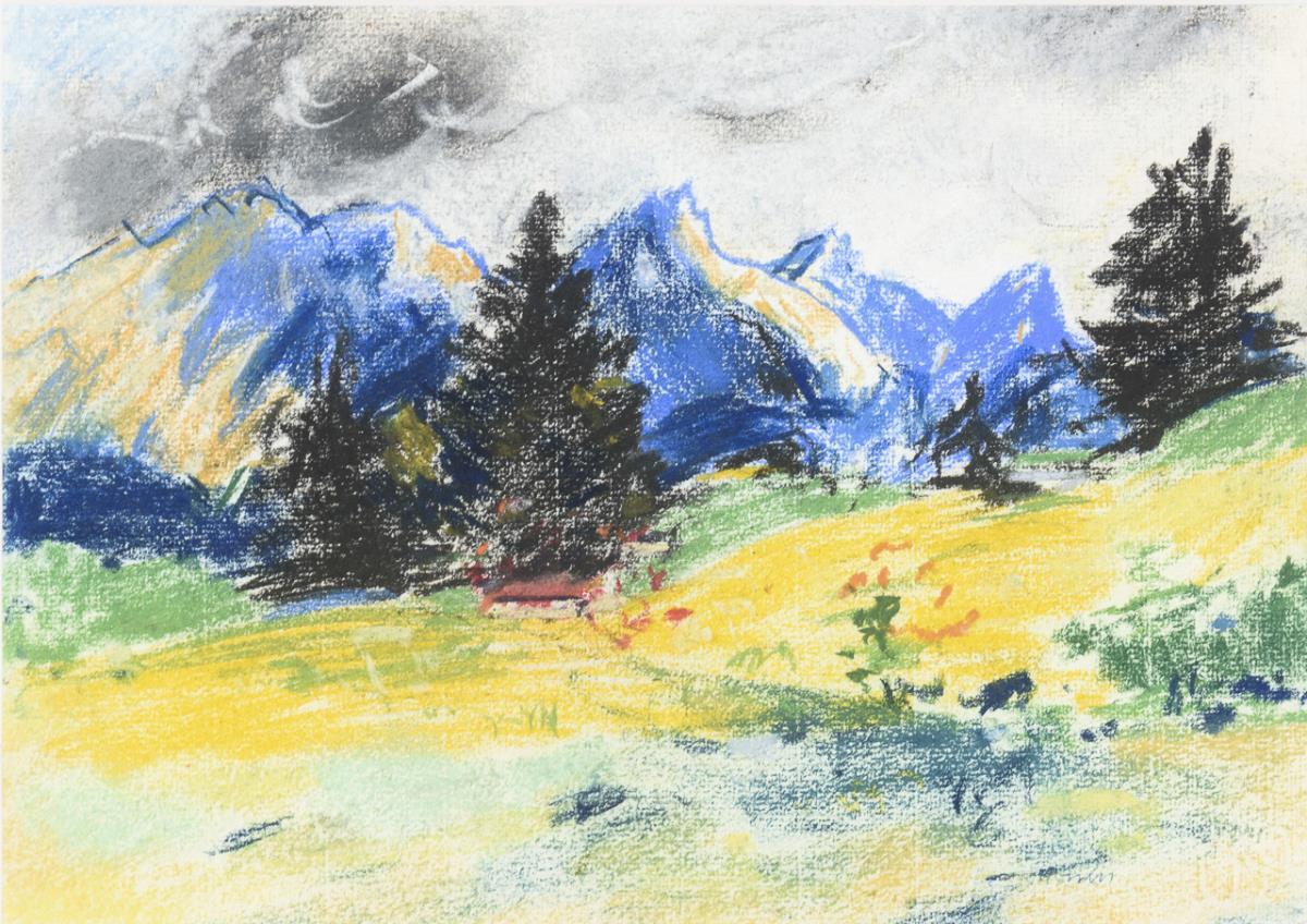 Farbkräftige Gebirgslandschaft mit blühender Wiese vor den Tannen und Berggipfeln.