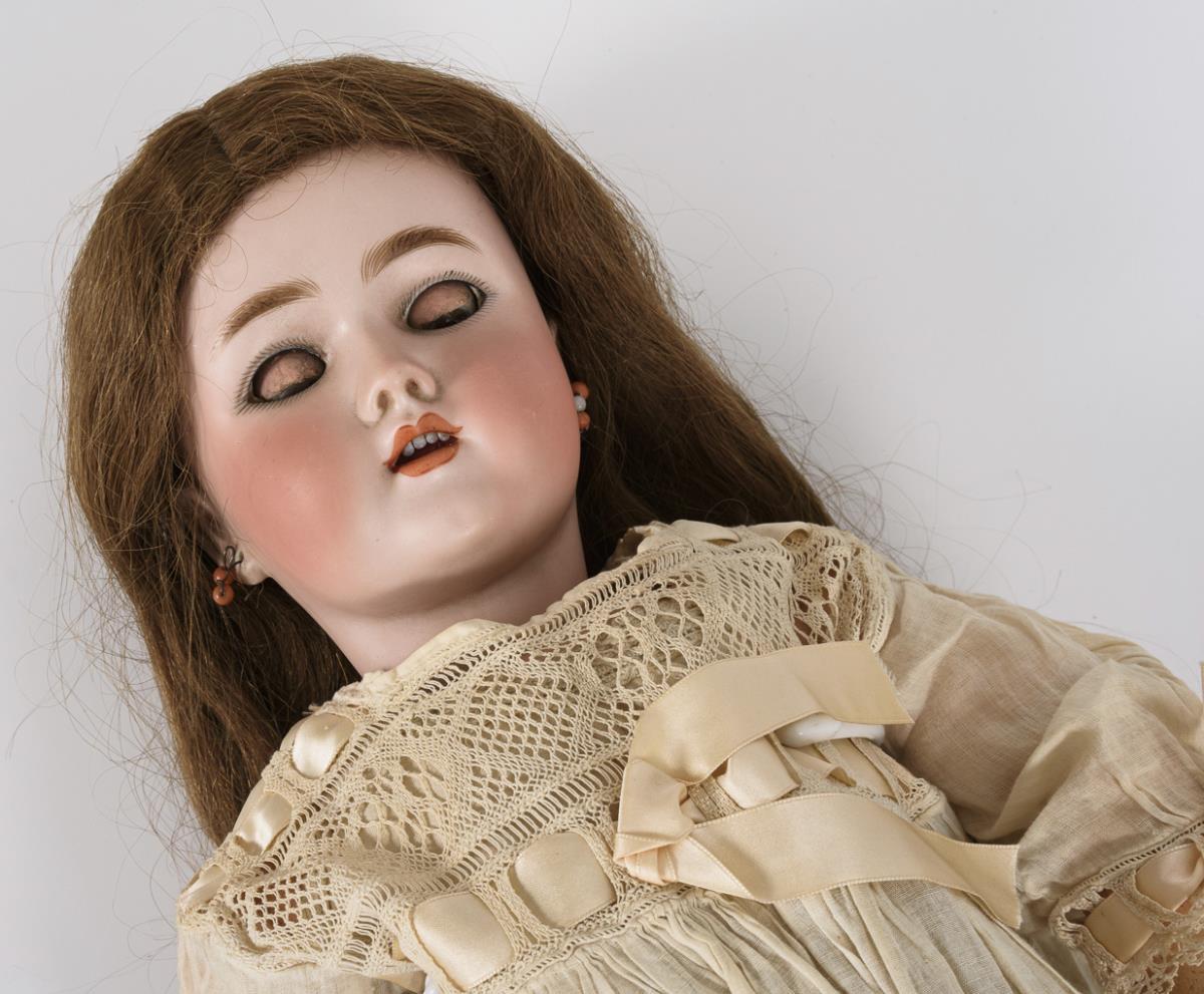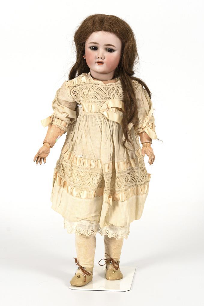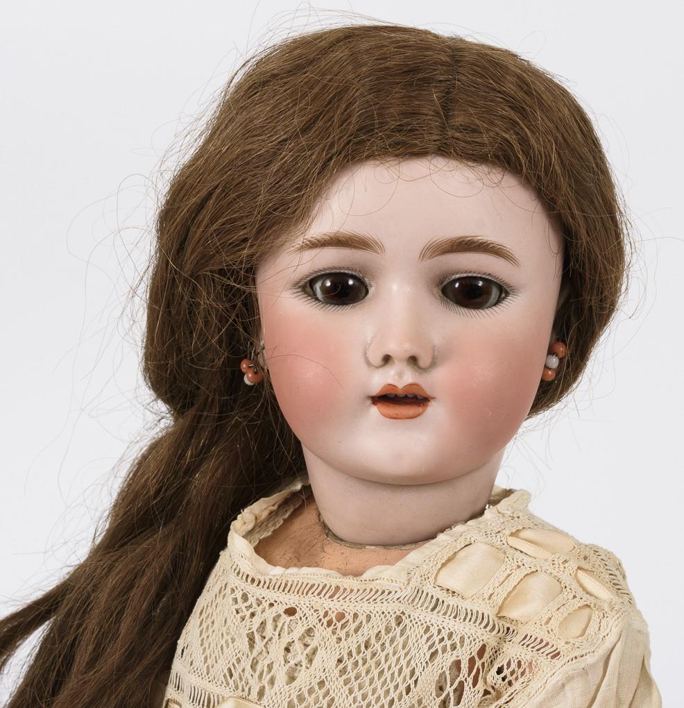 Kurbelkopf, braune Schlafaugen, Ohrringe, lange braune Echthaarperücke. 15-teiliger Gliederkörper. Weißes Kleid, helle Lederschuhe. Minimaler Perückenpull am Hinterkopf, Brandriss hinter dem linken und kleine Retusche hinter dem rechten Ohr, Ohrlöcher mit minimalen Chips.