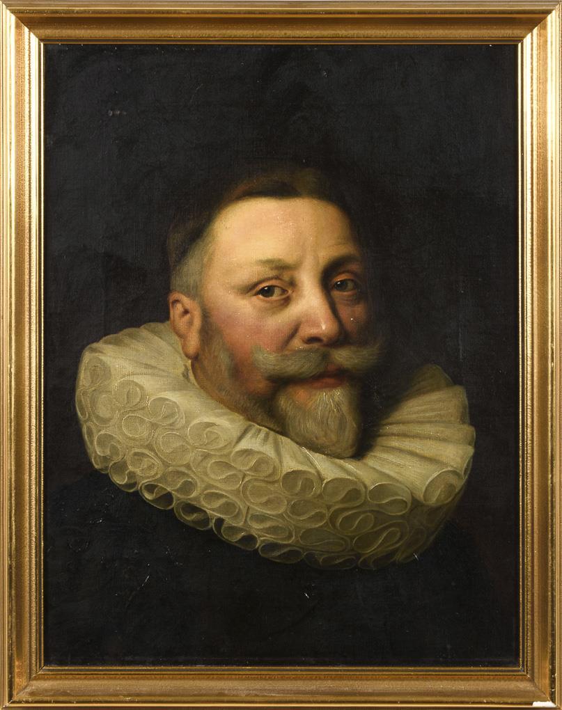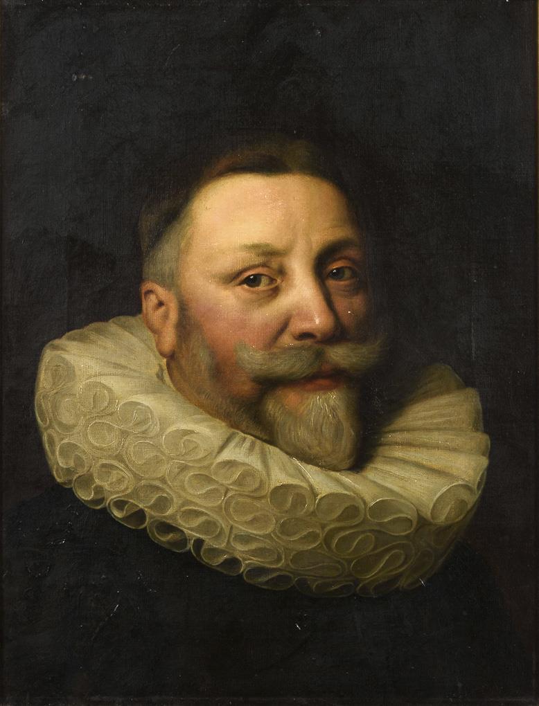 Porträt eines älteren Mannes in der Kleidung des 17. Jahrhunderts mit Mühlsteinkragen vor dunklem Hintergrund. Altersspuren.