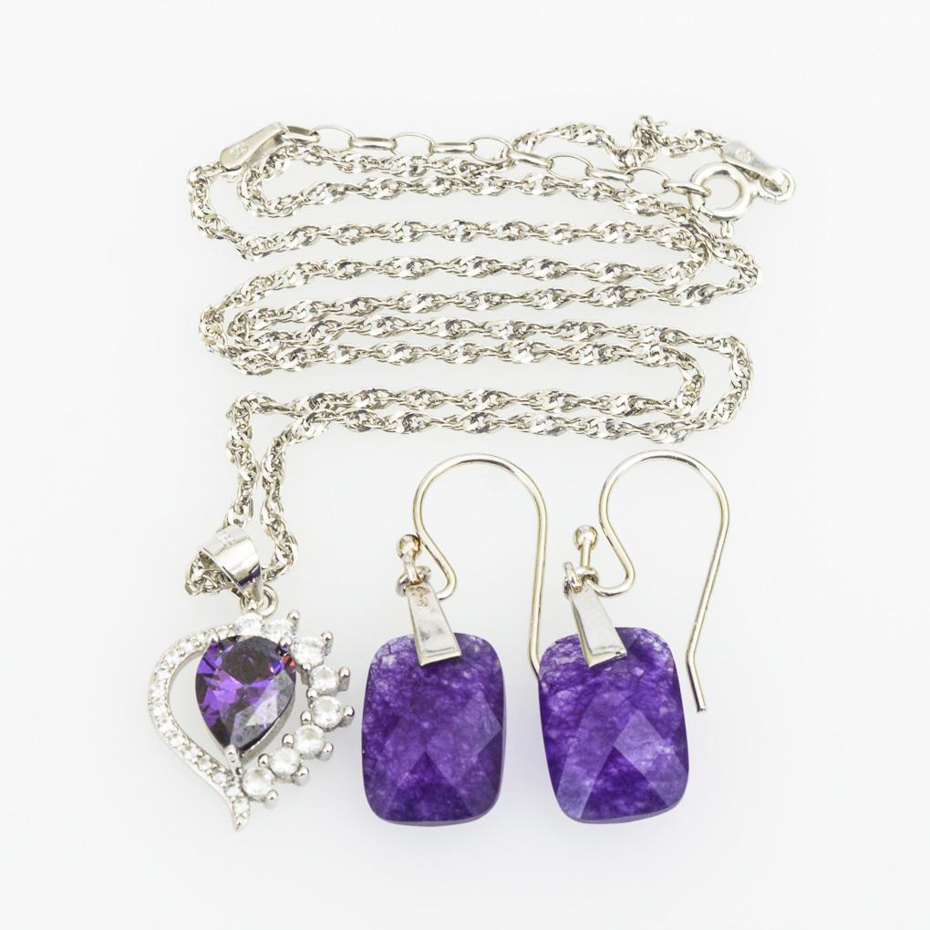 Moderner Anhänger an Kette und Ohrhängerpaar mit violetten Steinen?.