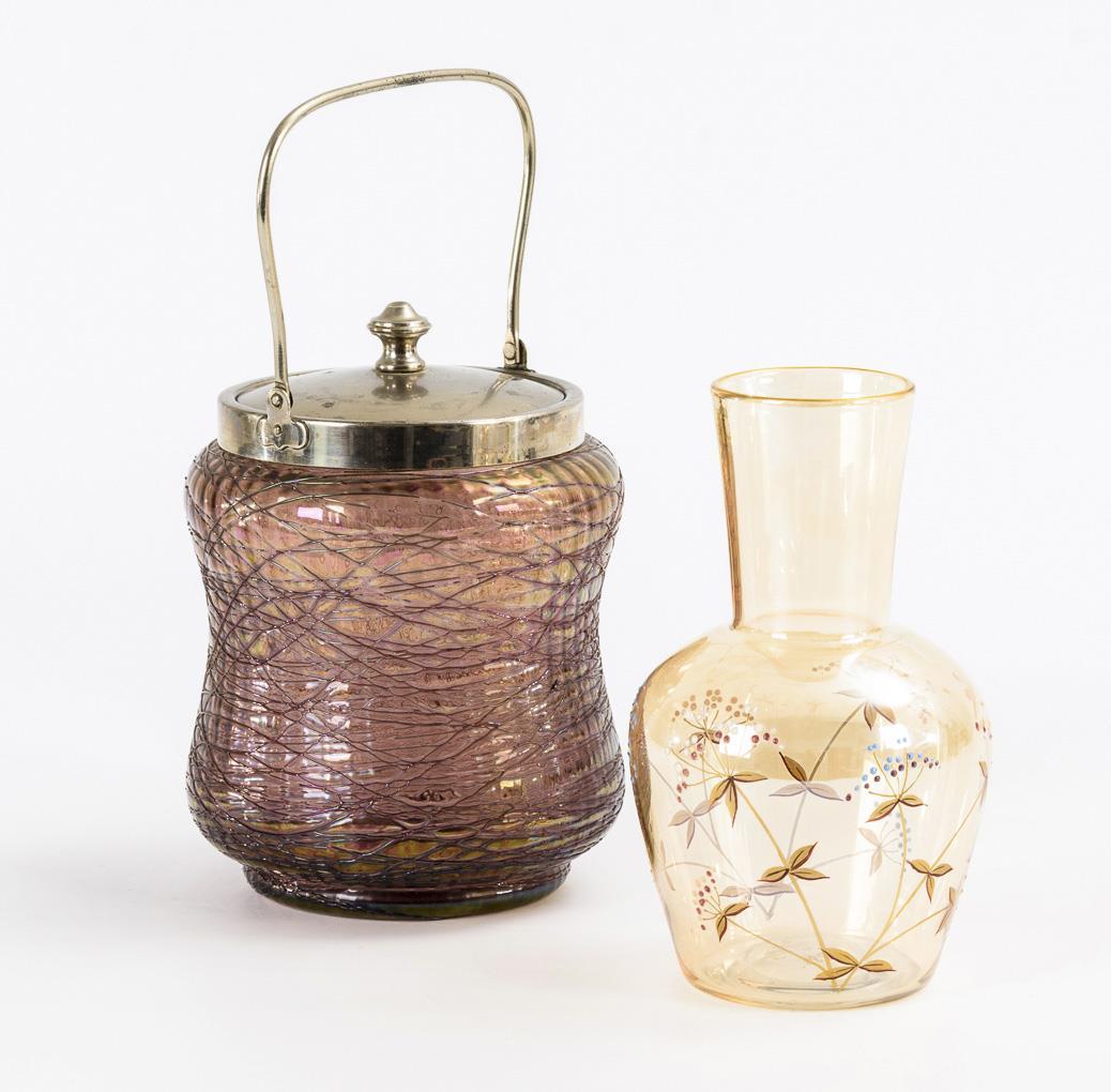 Konkave Dose aus violettem, längsoptisch formgeblasenem Glas, mit violettem Faden netzartig umsponnen; metallmontierter Rand mit Deckel und Bügelhenkel. / Balustervase Fritz Heckert (signiert "FH 387/3 883."): aus farblosem, irisiertem Glas mit polychromer Emailmalerei und Goldstaffage. Fäden der Dose partiell bestoßen.