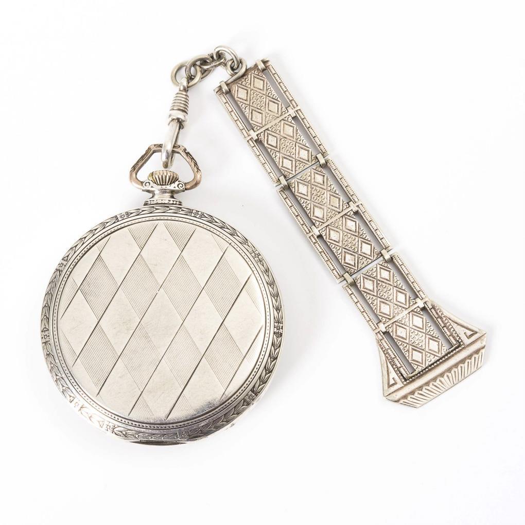 Flaches Gehäuse, Rückdeckel mit Rautendekor, kranzreliefierte Ränder. Alpacca-Châtelaine mit ornamental verzierten Gliedern, L 11,5 cm. Leichte Kratzer auf Zifferglas.
