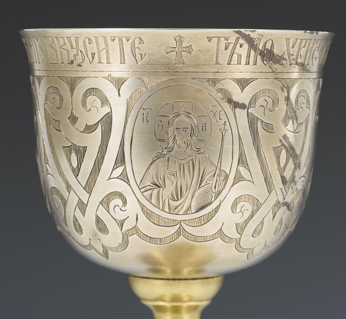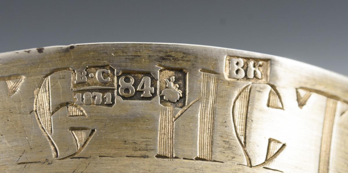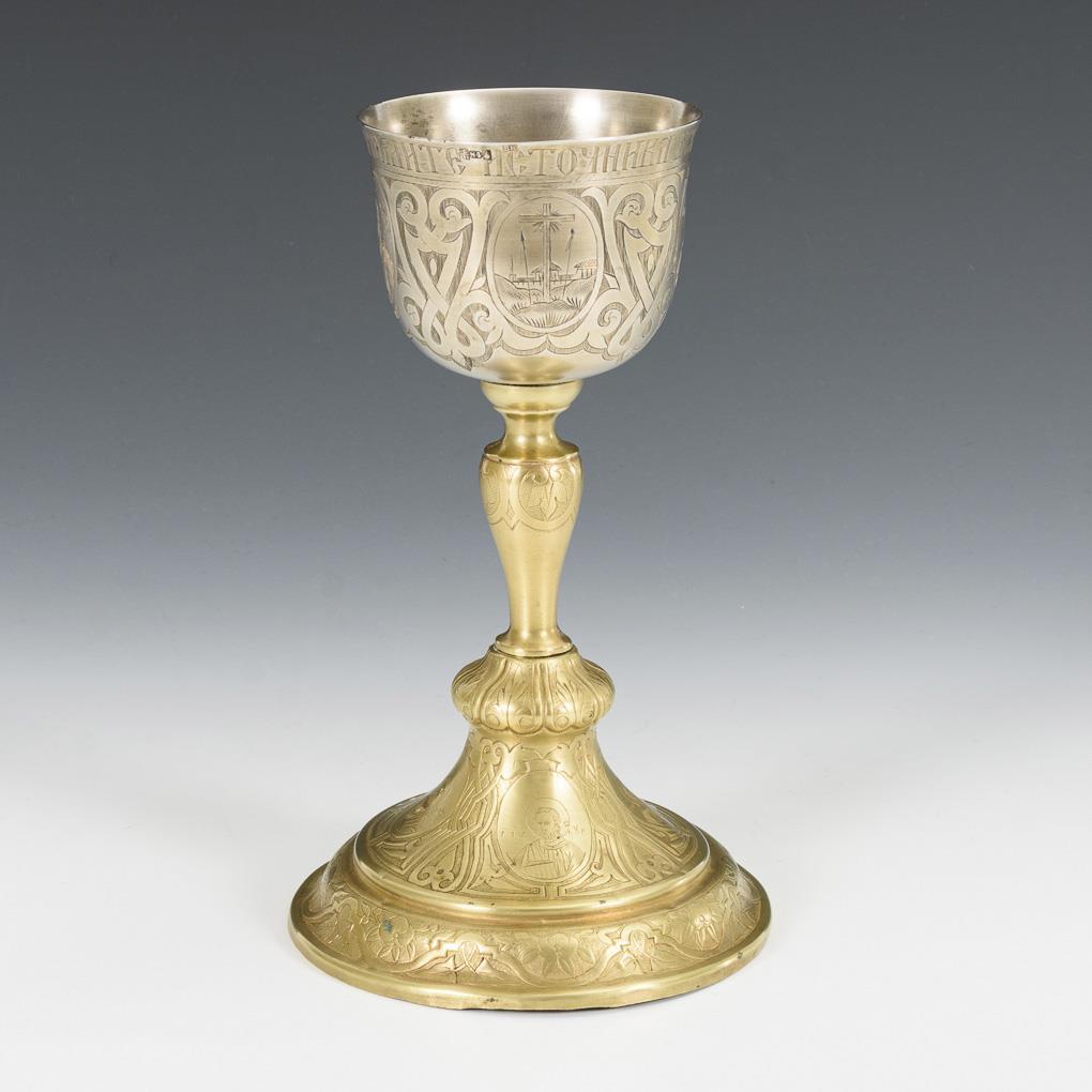 Silberkuppa mit umlaufender Inschrift, Rankenzier und 4 Ovalmedaillons. Reich verzierter Messingfuß mit 4 Heiligendarstellungen. Einige Dellen.