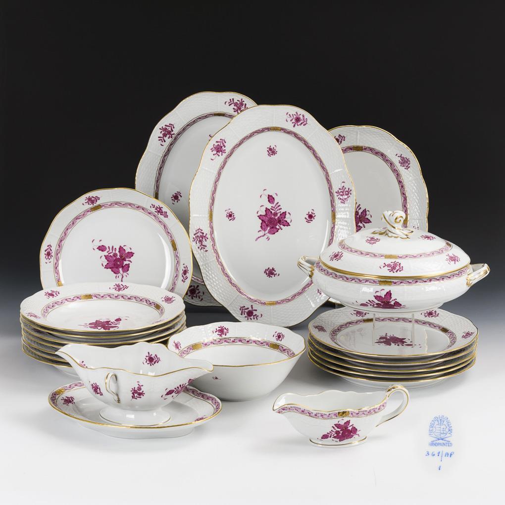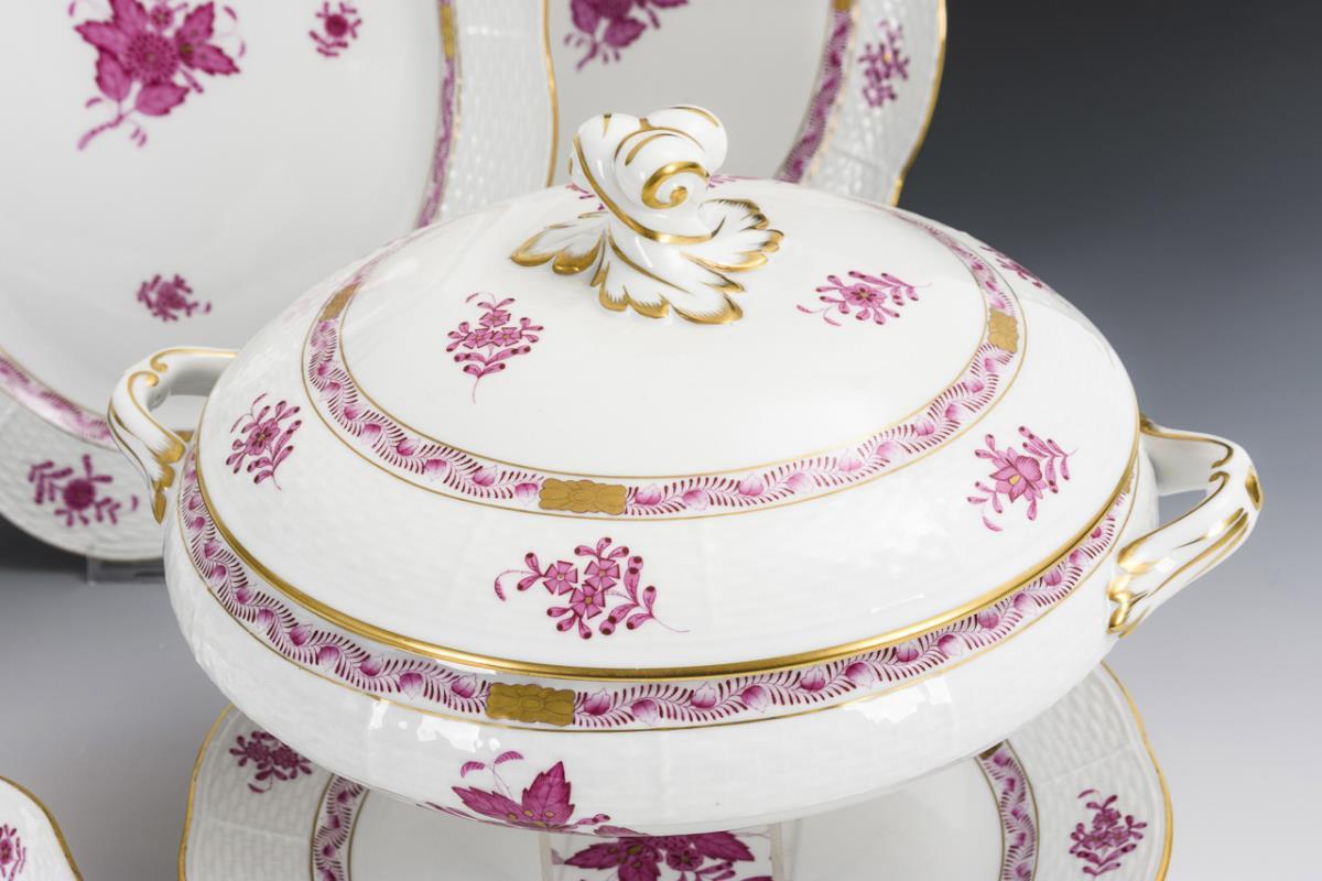 Form "Altozier". 5 Speiseteller, 7 Suppenteller, 1 Buttergießer (L 18,5 cm), 1 Sauciere, 1 Schale (Ø 24,5 cm), 1 Schüssel (Ø 20,5 cm), 1 Tablett (L 31,5 cm), 2 Ovalplatten (L 37 cm) und 1 Terrine (Ø 28,5 cm).