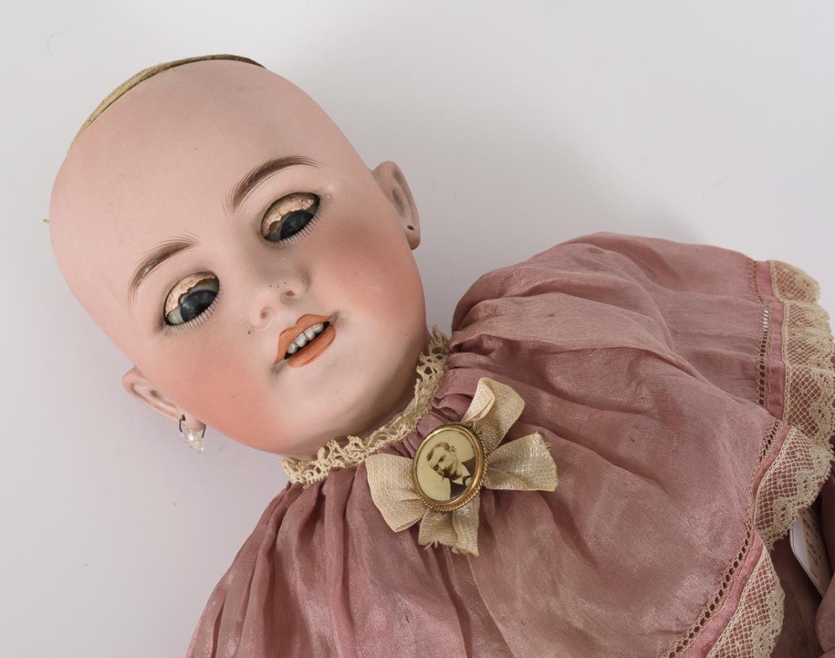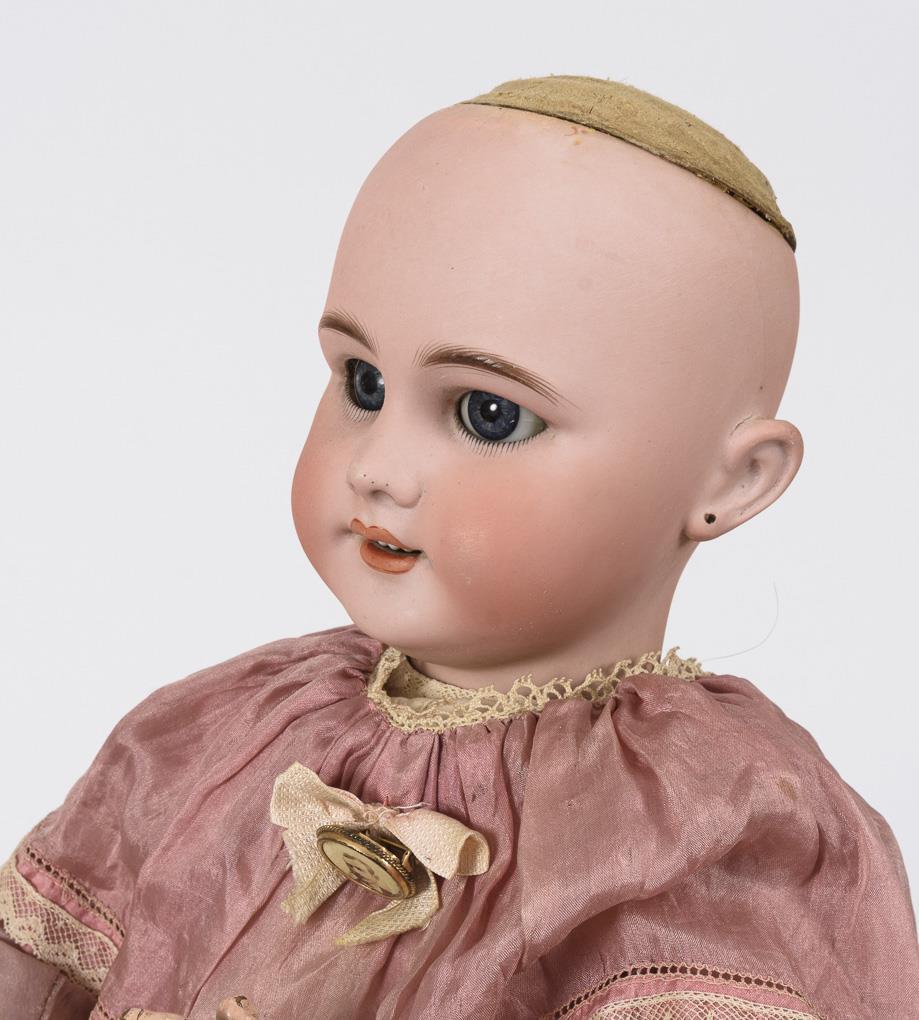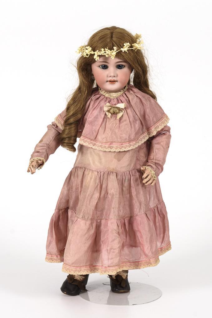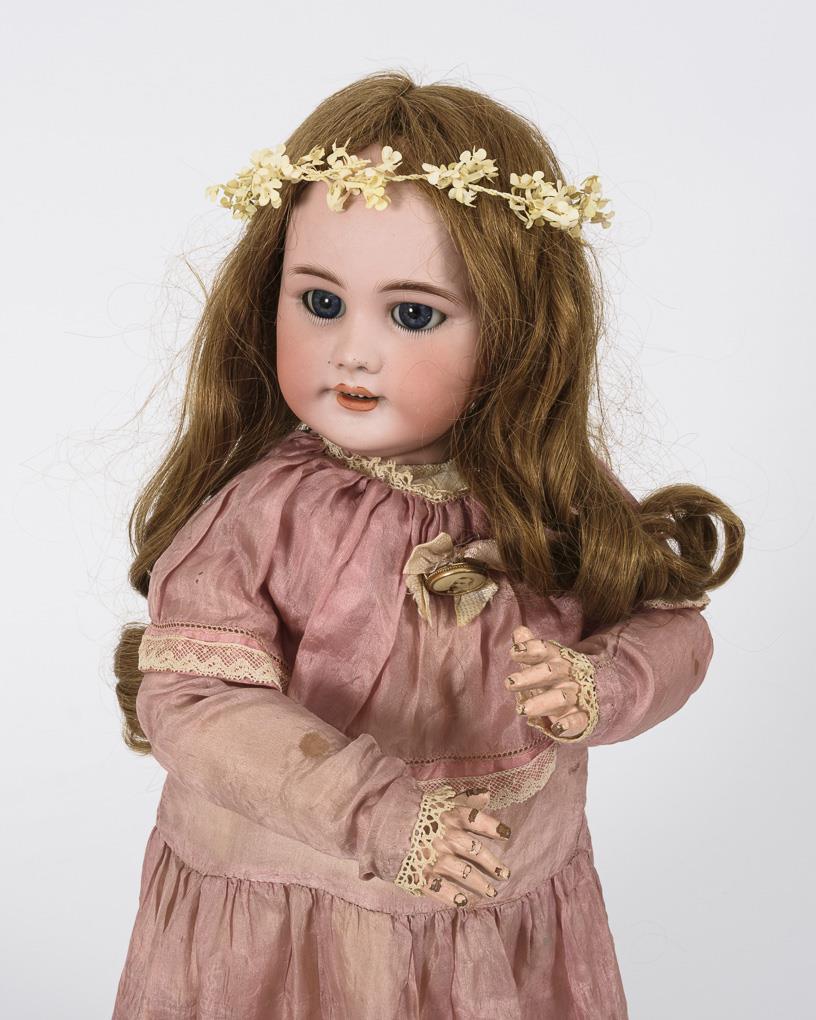 Crank head, blue sleeping eyes, pierced ears with 1 earring, brunette human hair wig with long corkscrew curls. 11-piece jointed body with 2-piece torso, voice and original label "Bébé Jumeau". Original delicate pink dress with defects, original black "Jumeau" leather shoes, floral wreath in hair. Head x-rayed: without defects, only fine burn cracks behind the ears and 1 barely visible chip on the crown of the head. Left eye with hairline cracks. Body with small color defects.
