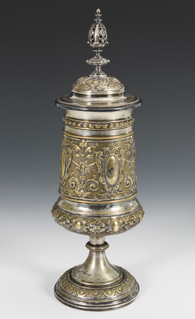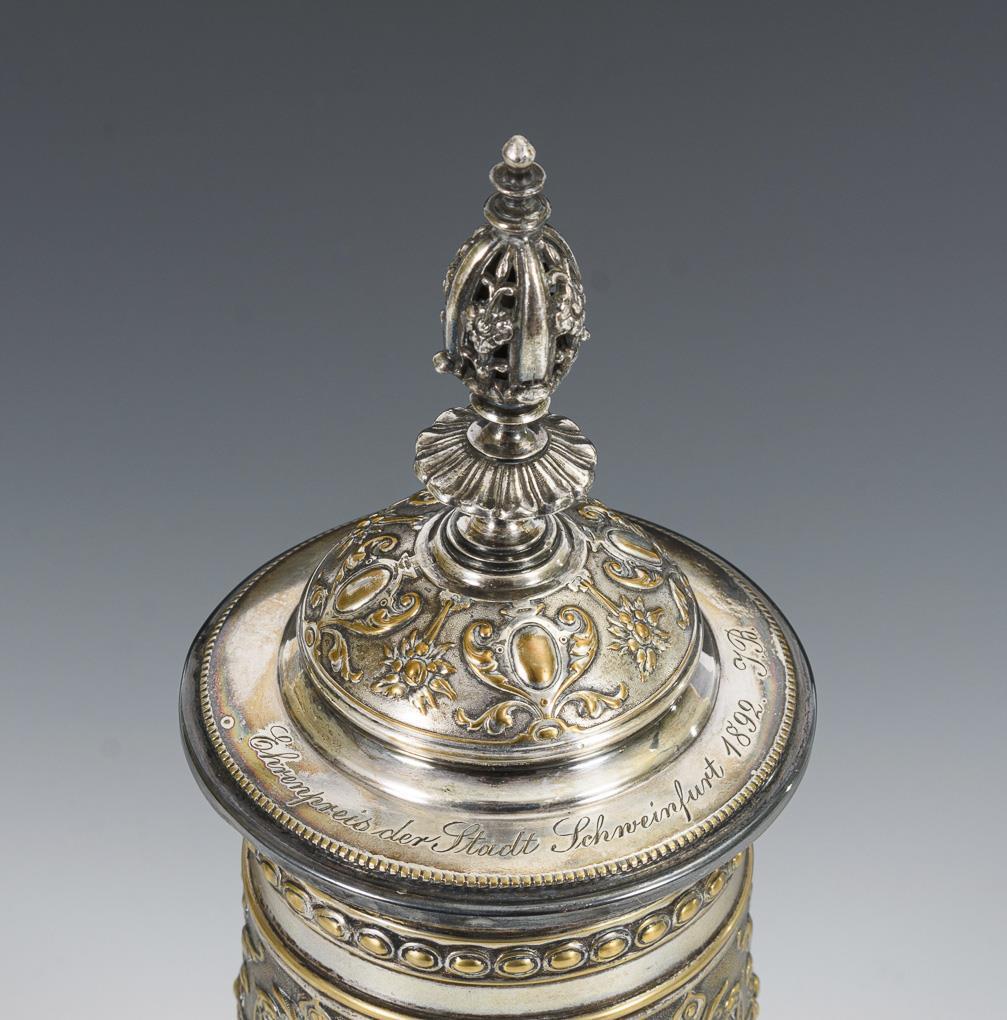 Gründerzeitlich reliefierter Preispokal mit Gravur auf dem Deckel: "Ehrenpreis der Stadt Schweinfurt 1892. IB". Fuß gestaucht, Versilberung stark berieben.