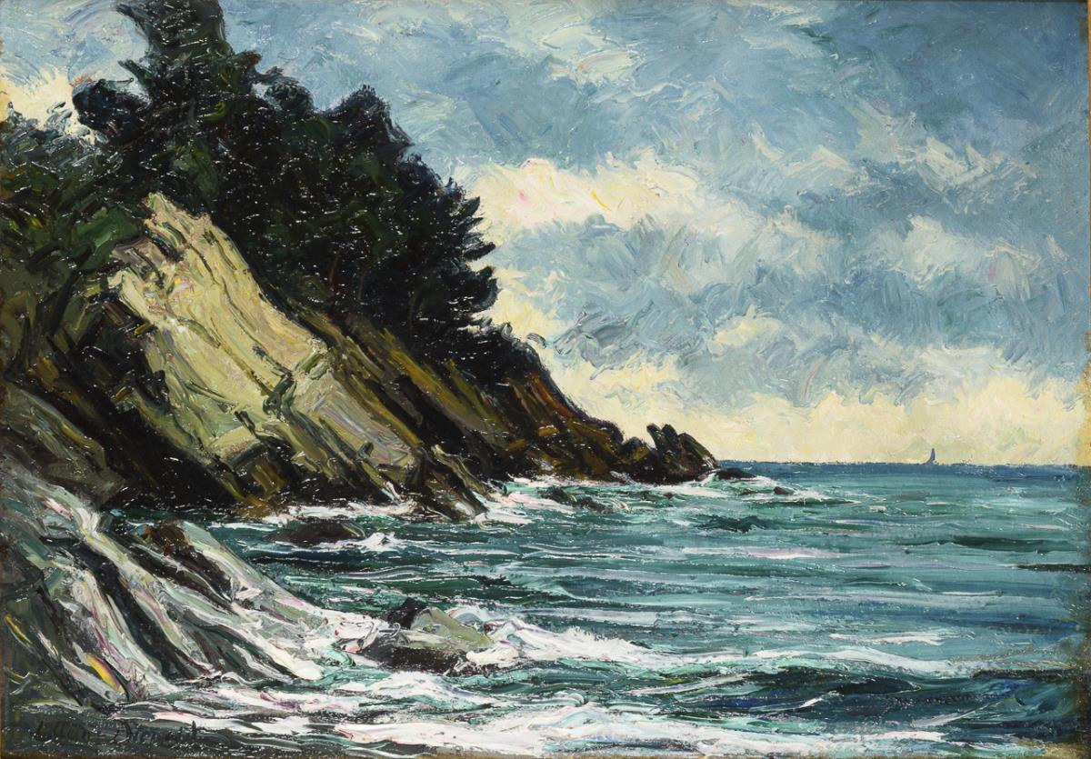 Pastos gemalte felsige Küste mit Waldstück unter wolkigem Himmel. Leichte Altersspuren.