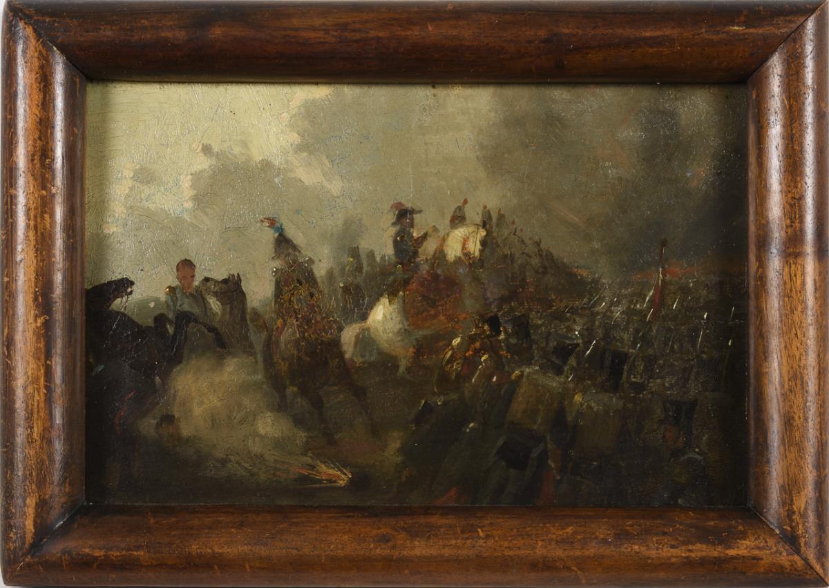 Reiter und Infanteristen auf dem Schlachtfeld unter bewölktem Himmel. Leichte Altersspuren.