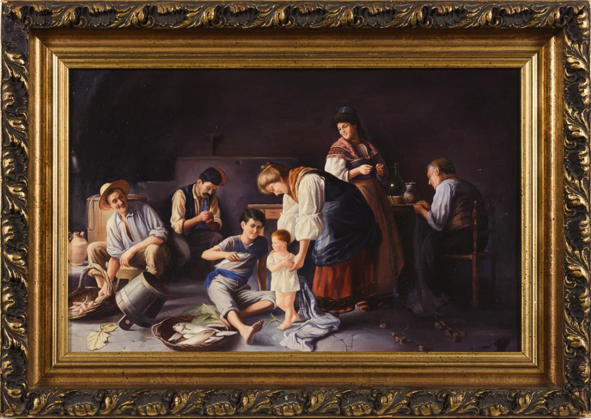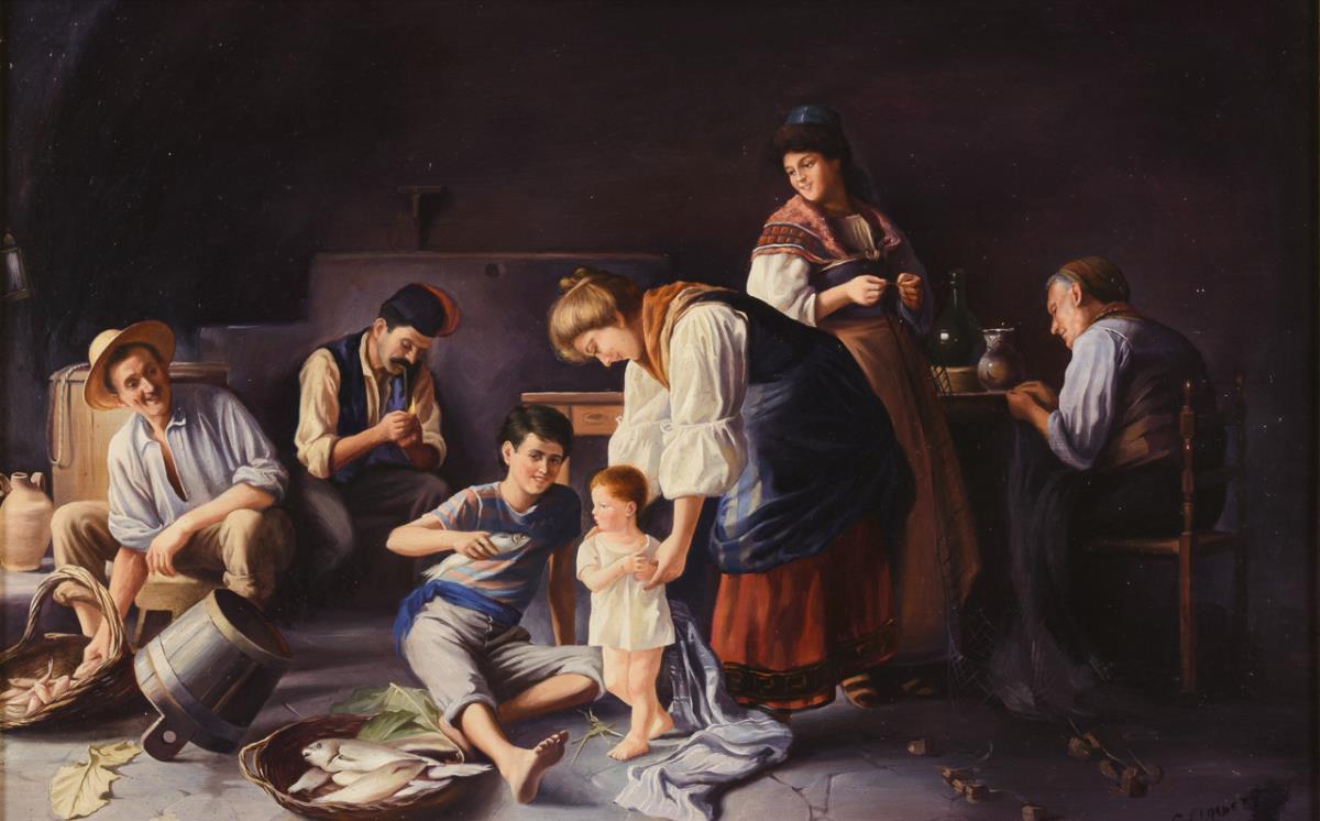 In ausgelassener Stimmung dargestellte Familie in der Stube mit dem Fang des Tages und beim Flicken der Netze.