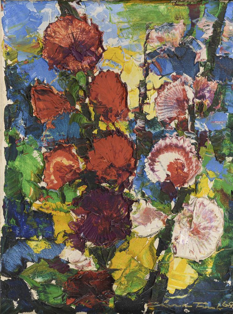 Expressiv gemalte Blumen mit verschiedenfarbigen Blüten.