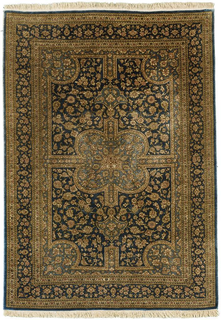 Seide auf Seide, äußerst feine Handknüpfung mit fast 1 Million Knoten pro qm. Antikisierender Farbdekor in vorwiegend Blau und Braun. Ca. 79 x 116 cm.