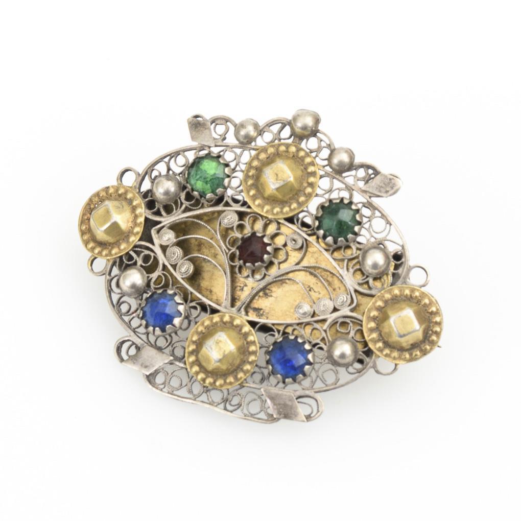 Filigranbrosche mit Glasbesatz. Hakenverschluss.