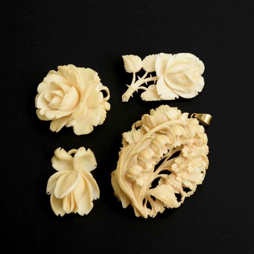 3 Elfenbeinanhänger und Elfenbeinbrosche 1920er Jahre.