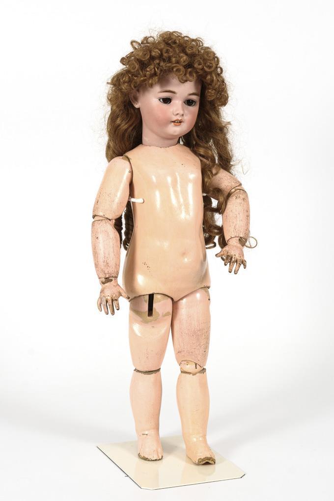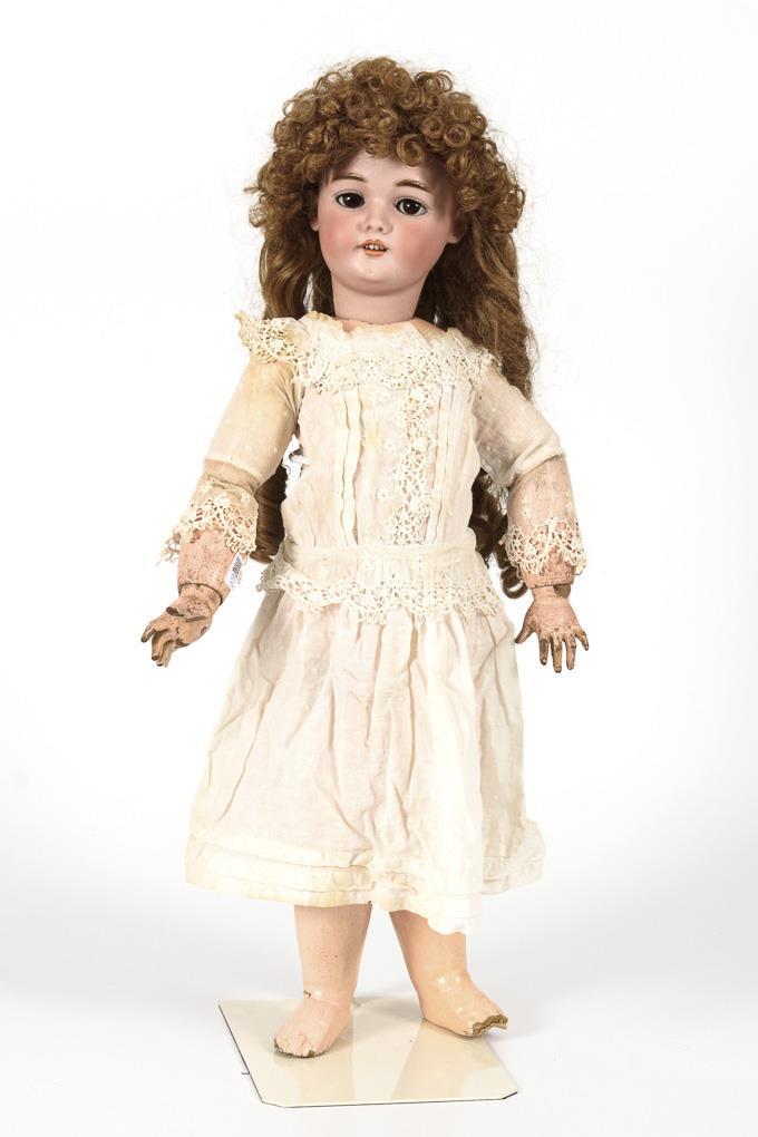 Kurbelkopf, braune Schlafaugen mit Echthaarwimpern, Ohrlöcher, rotbraune Lockenperücke. 11-teiliger Gliederkörper. Weißes Kleid. Kopf durchleuchtet: ohne Defekte. Körper mit Farbdefekten, Hände berieben, 1 Finger geklebt, 1 Fuß verformt.