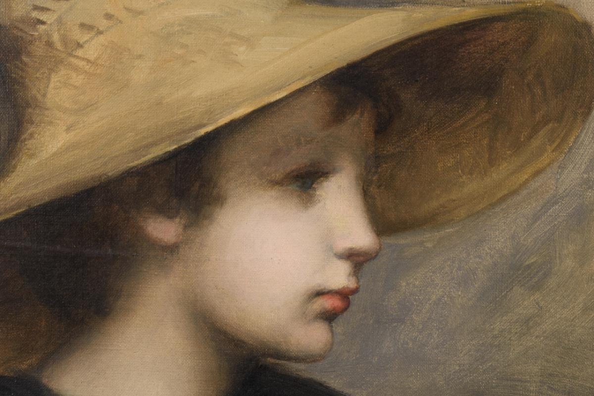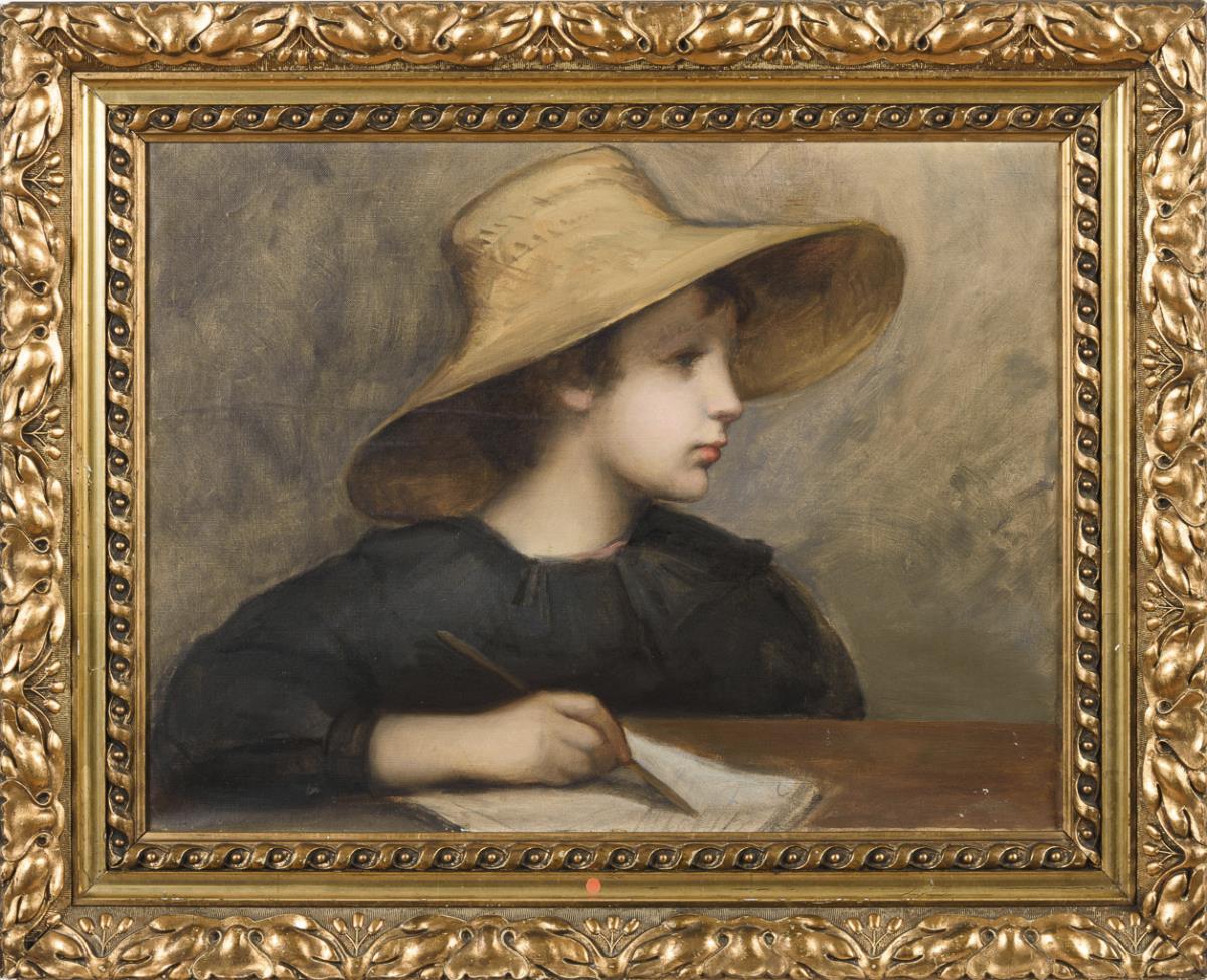 Aufmerksam zur Seite blickendes Mädchen mit großem Sommerhut. Altersspuren.