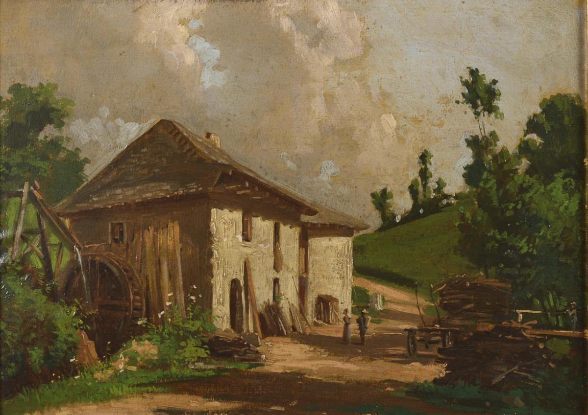 Die große Mühle mit Staffagefiguren im Sonnenschein.
