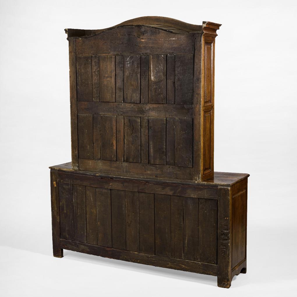 Hoher Küchen-Vitrinenaufsatzschrank mit 3-türigem, kastenförmigen Unterteil und 2 Schüben (mittig ein Blenderschub), 2-türiger, ergänzter Aufsatz mit geschweiftem Giebel und Sprossenfenstern; verziert mit kassettierten, teils geschweiften Füllungen. Vitrinenaufsatz mit 4 höhenverstellbaren Einlegeböden. Restauriert, zusammengesetzt, teils fehlende Applikationen, Beschläge ergänzt.