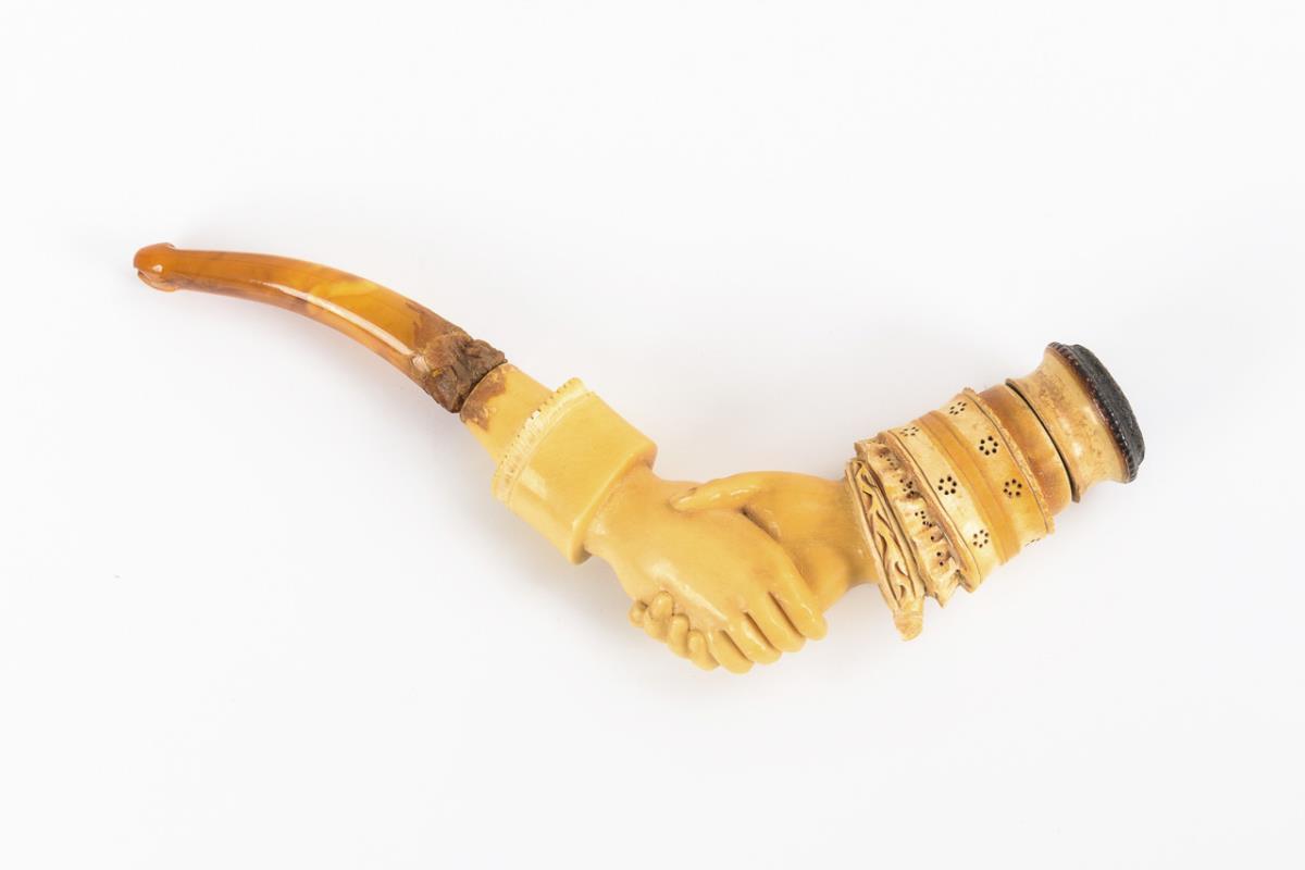 Zwei ineinander greifende Hände (Handtreue) mit Manschetten. Mundstück aus Bernstein, mit Defekt. Etui "Garanti Sublime".