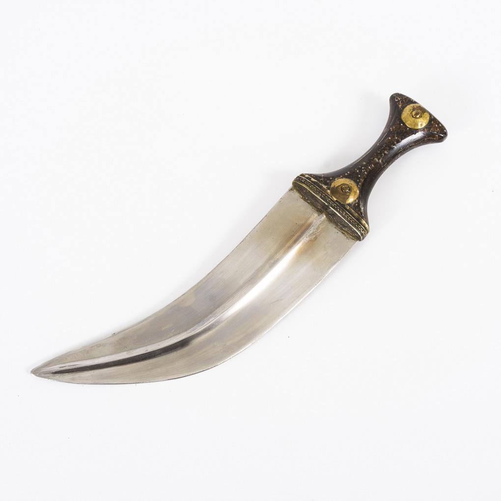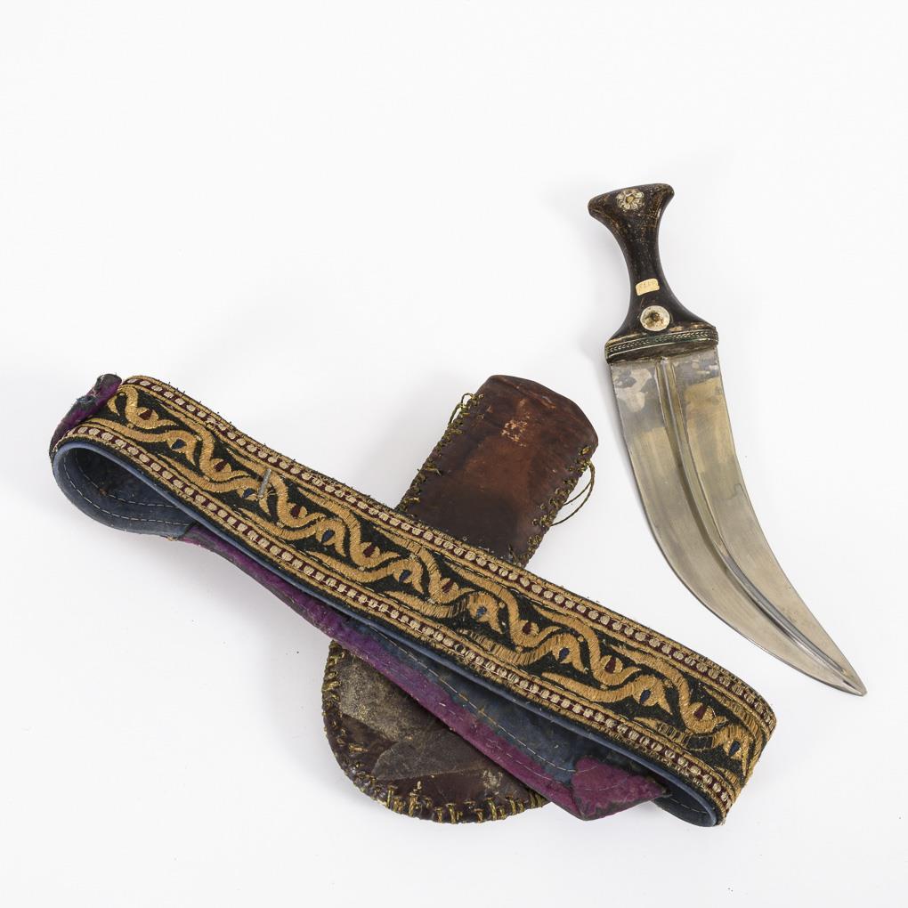 Zweischneidige Klinge mit Mittelgrat. Holzgriff mit Messingnieten. Holzscheide und Gürtel mit Fadenwicklung bzw. Stickereien. Altersspuren, Fadenwicklung teils defekt.