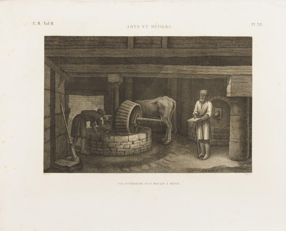 Verschiedene handwerkliche Darstellungen von Handwerkern, Handwerksgerät und Räumlichkeiten nach Zeichnungen von Conté, aus: "Description de l'Egypte, ou recueil des observations et des recherches qui ont été faites en Egypte pendant l'expédition de l'armée française, publié par les ordres de sa majesté l'empereur Napoléon le Grand, Paris, 1809 - 1822, E.M. Vol. II.", hrsg. von Edme Francois Jomard. Das Werk mit mehr als 3000 Abbildungen entstand als Ergebnis der ägyptischen Expedition Napoléon Bonapartes (1798 - 1801), die einen wesentlichen Anstoß zur Entwicklung der Ägyptologie als Wissenschaft gab. Je etwas stockfleckig und mit kleinen Knicken an den Ecken und Rändern.