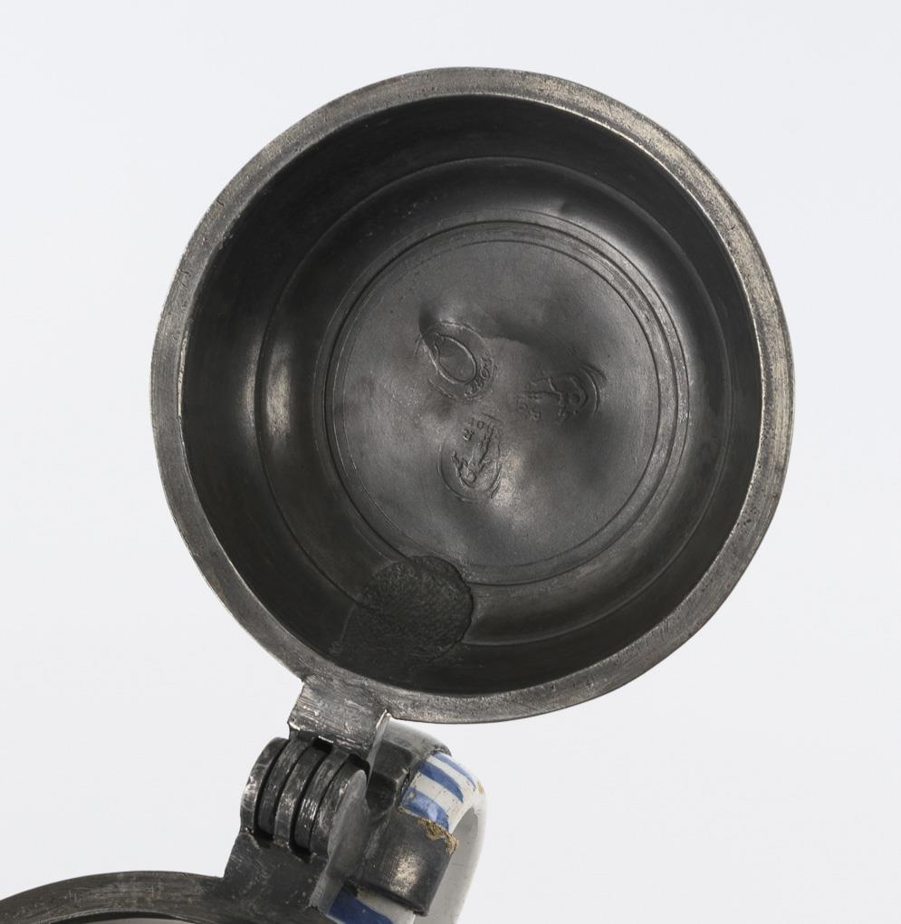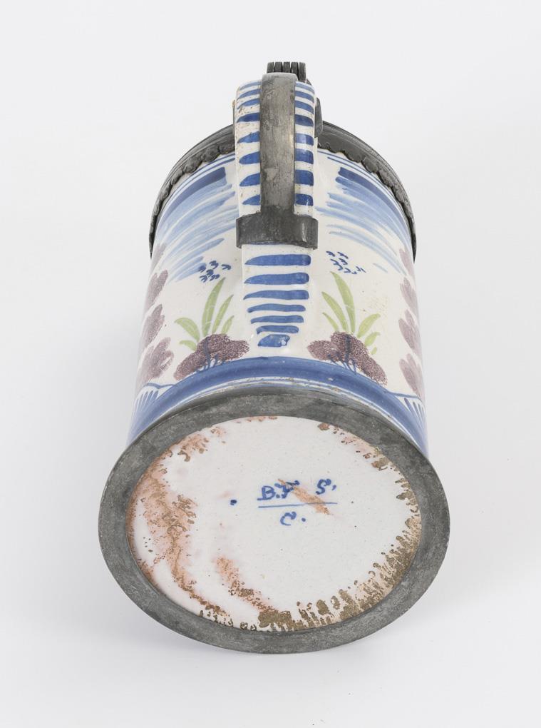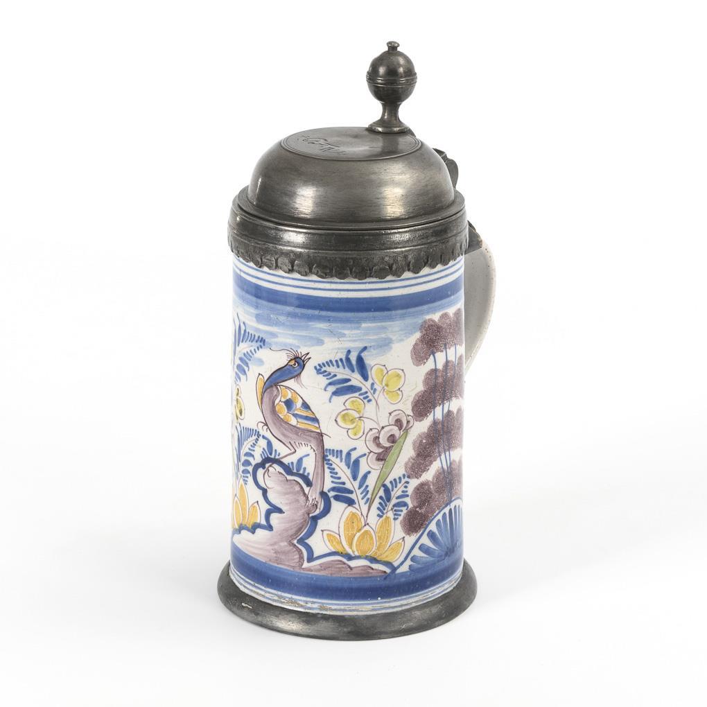 Zylinderkrug mit strichverziertem Bandhenkel. Schauseitig ein Pfau auf einem Felsen, flankiert von Etagenbäumen und Blumen. Zinndeckel mit Kugeldrücker, graviert "CFW", innen gepunzt, Leinenfleck, Henkelband und Zinnstandring. Feiner Wandungsriss, Glasurbereibungen und minimale Chips, Zinn repariert.