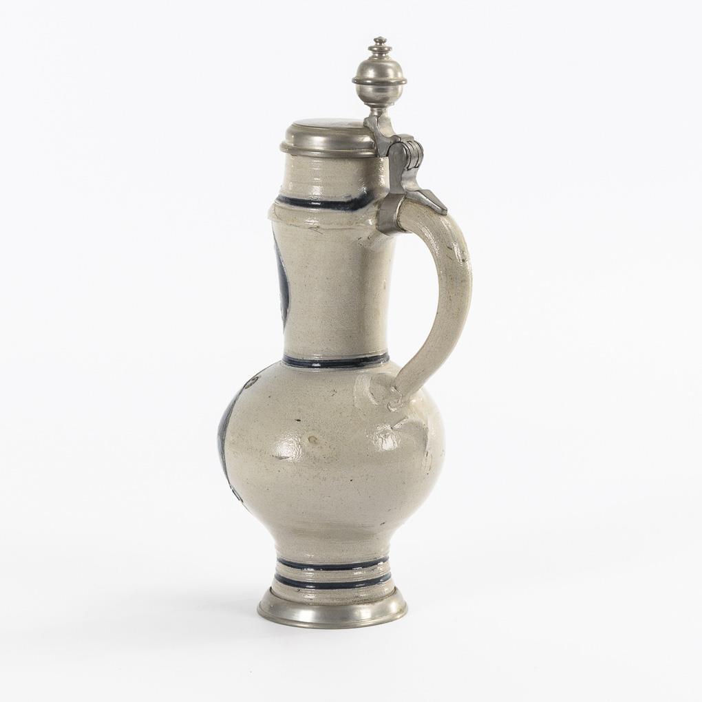 Kugelbauch, abgesetzter Zylinderhals und Stand, Bandhenkel. Zinndeckel mit Kugeldrücker und Zinnstandring passend ergänzt. Lippe mit Brandriss, kleine Bestoßung am Stand.