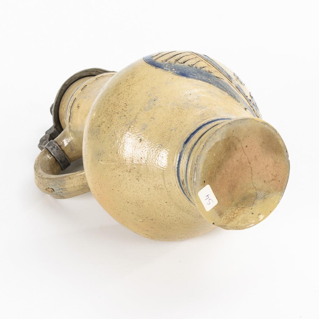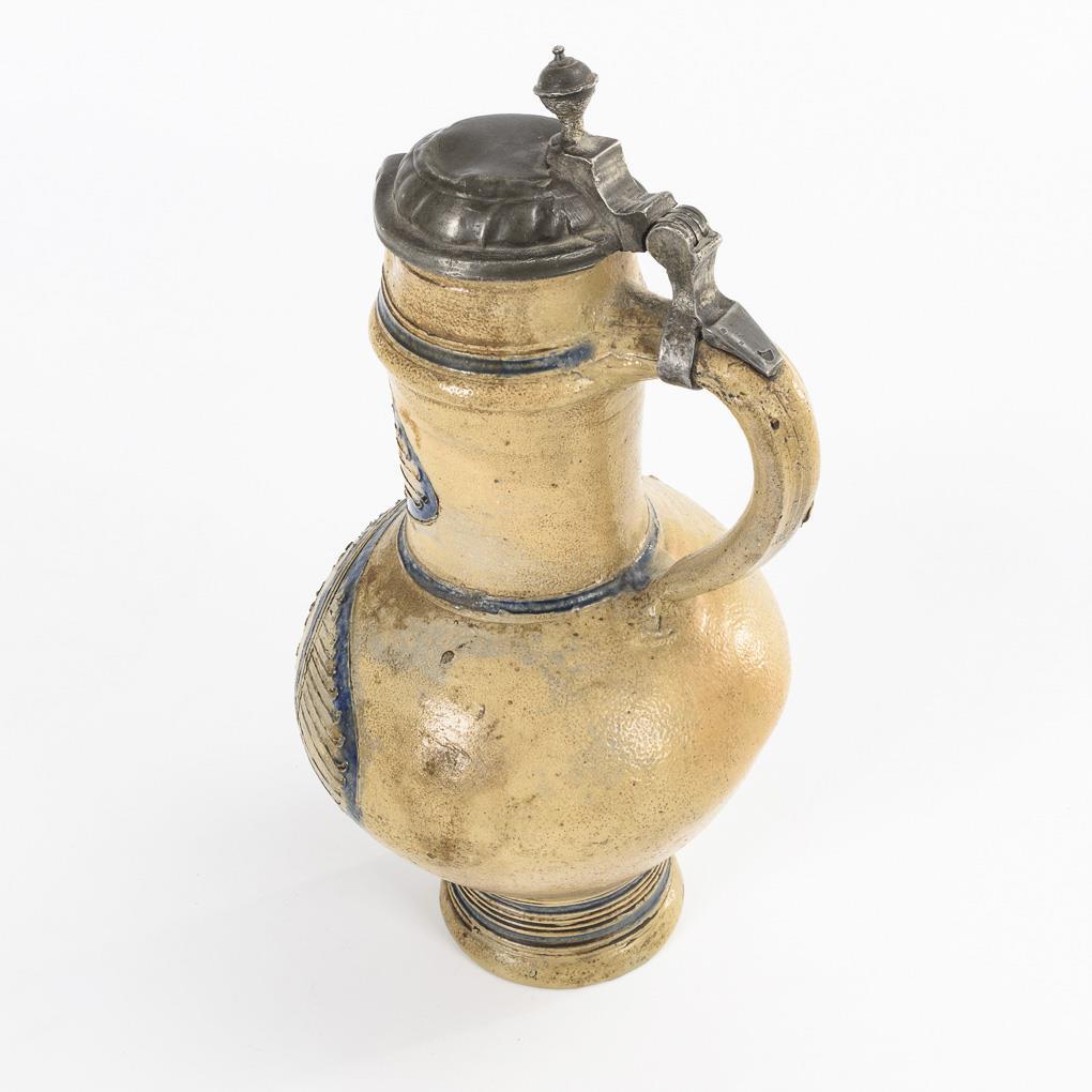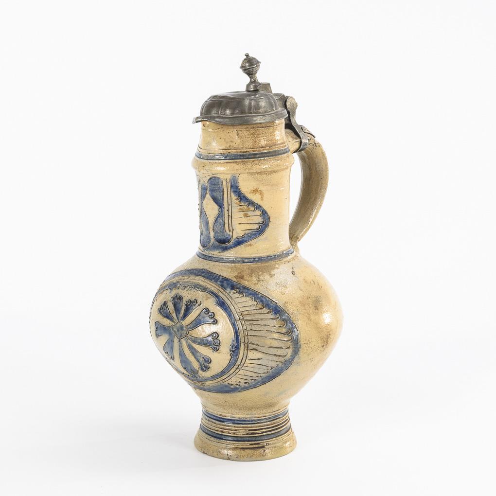 Kugelbauch, abgesetzter Zylinderhals und gerillter Stand, Bandhenkel. Profilierter Zinndeckel mit Kugeldrücker, innen Leinenfleck. Restauriert, partiell noch leicht rissig, Zinndeckel mit Defekten.