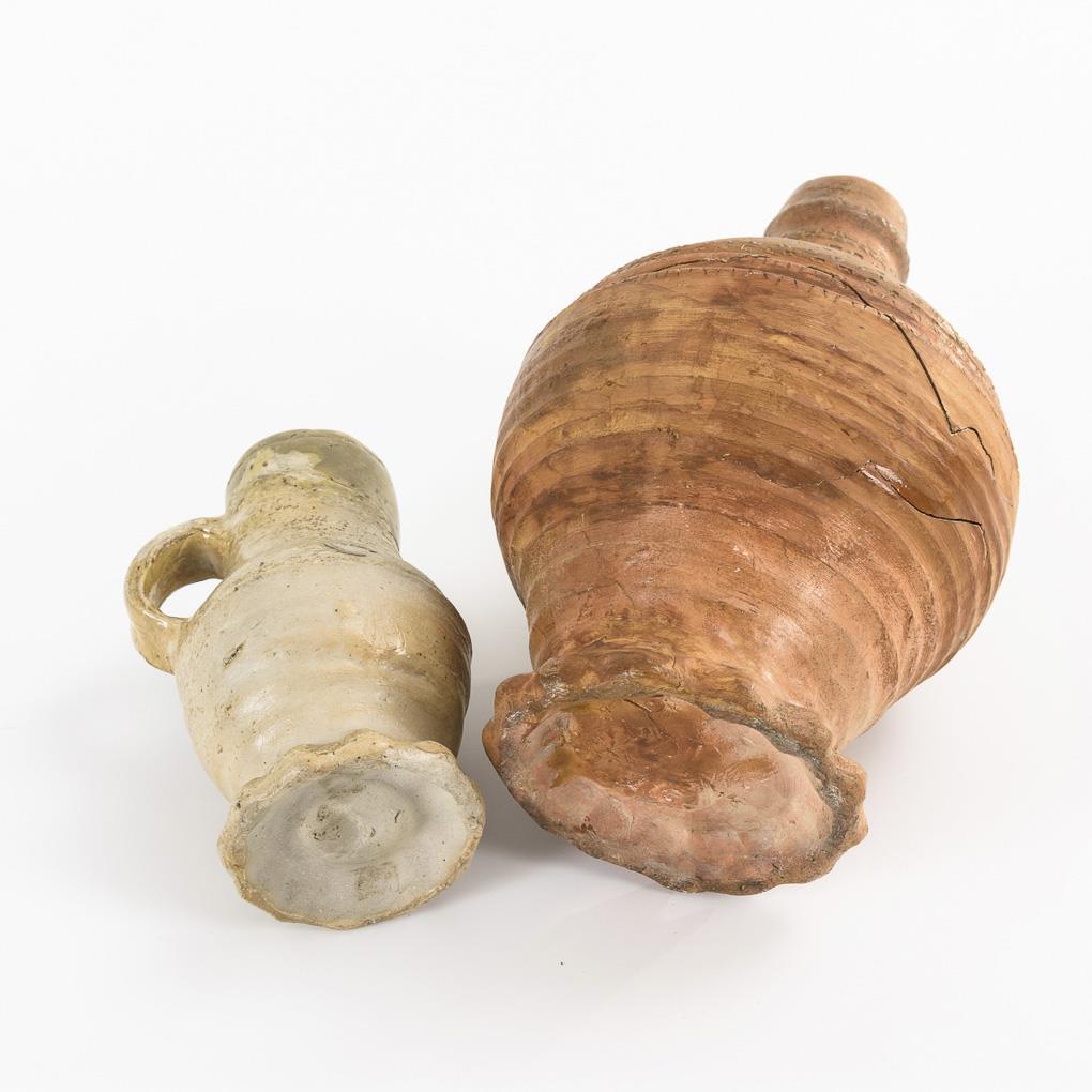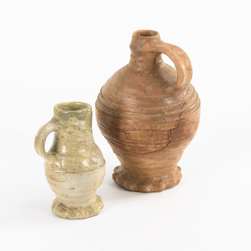 Rötlicher Krug (wohl Frechen) mit Kugelbauch und gerillter Wandung, Enghals und gekehltem Bandhenkel, Wellenfuß. Rollstempelfries (H 22,5 cm). Kleiner Krug (Siegburg) aus grauem Steinzeug, Zylinderhals und gekehlter Bandhenkel, aufgedrehter Wandungsgrat, Wellenfuß (H 14,5 cm). Jeweils gebrochen und restauriert.