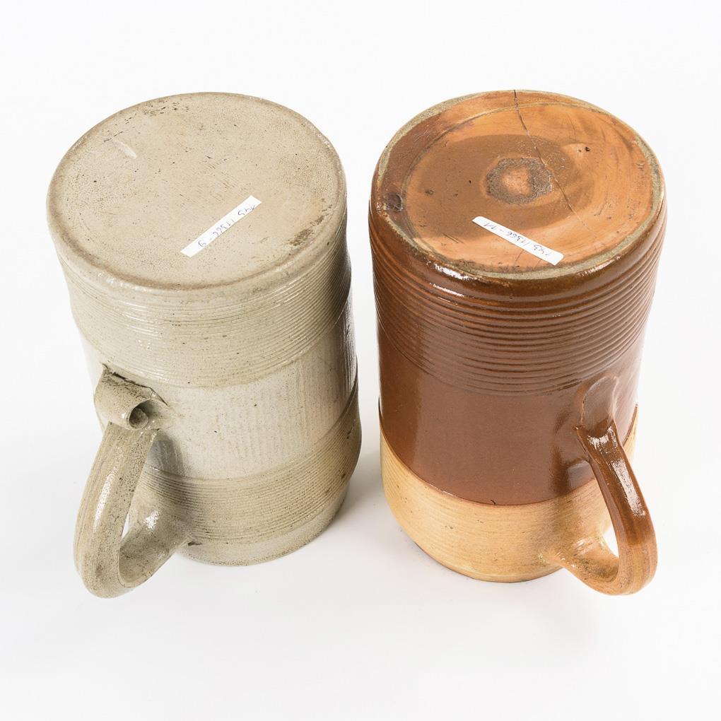 Zylinderhumpen mit Querrillenzier. 1x grau, mit aufgelegter Reserve und endvolutiertem Bandhenkel, Wandungshaarriss (H 19 cm). 1x braun, rissig und geklebt (H 19,5 cm). Ohne Deckel.