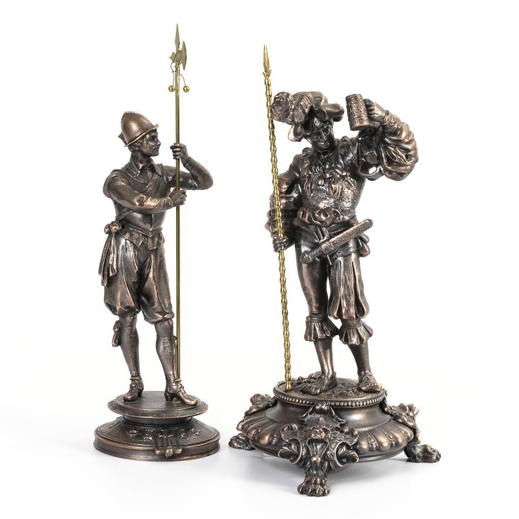 Prächtig gekleideter Landsknecht auf Pracht-Sockel bzw. Mann mit Hellebarde auf verziertem Sockel. 2 Haarrisse und 2 Reparaturen, einige Fehlstellen, jünger bronziert.