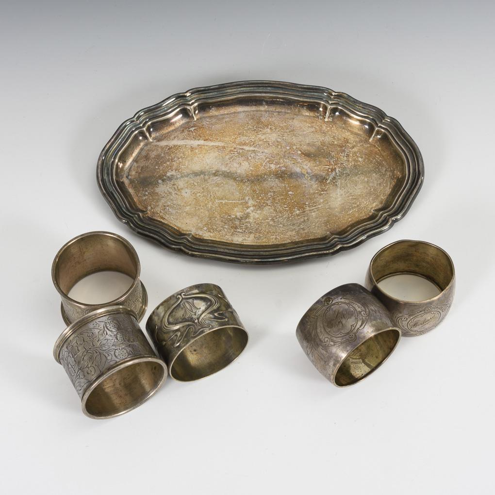 Ovales Tablett mit Profilrand, 2 Serviettenring-Paare und 1 Jugendstil-Serviettenring, datiert "(19)06". Mit Monogramm bzw. Namensgravuren. Alters- und Gebrauchsspuren.