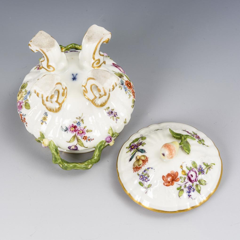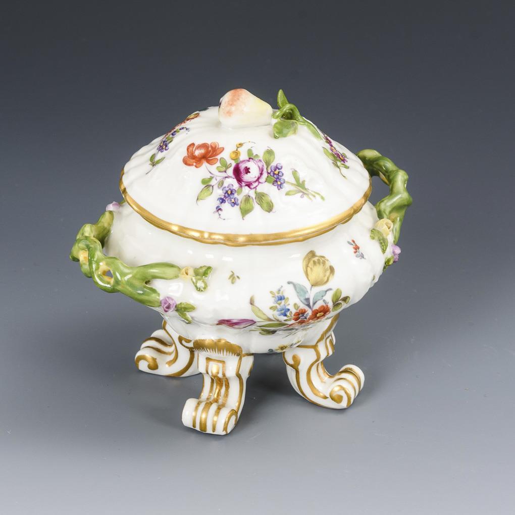 Zuckerdose mit vier Volutenfüßen, zwei Asthenkeln und Deckel mit Birnenknauf. Partiell Blätter und 1 Henkel restauriert.