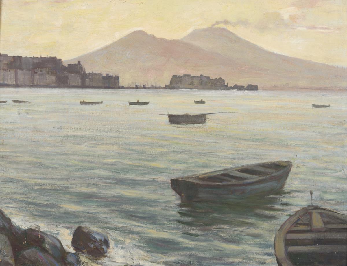 Fischerboote auf dem Wasser nahe der süditalienischen Stadt mit Blick zum Vulkan. Das Bild schuf der Maler während seines Aufenthalts in Italien, bei dem er den Rompreis erhielt.