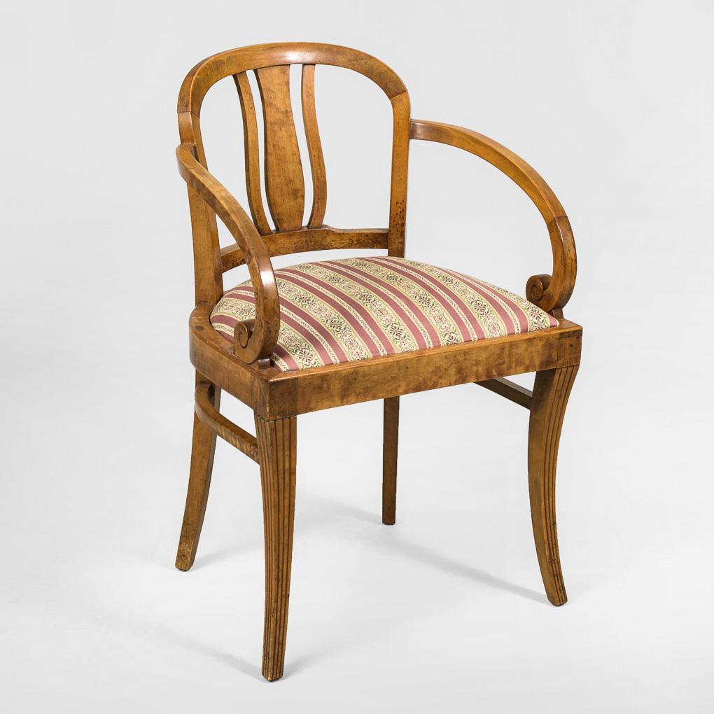 Schlichter Polsterstuhl mit volutierten Armlehnen und Rückenlehne mit 3-fach versprosstem Mittelbrett, champagnerfarbener Bezug mit roséfarbenen Streifen und Blumenranken. Restauriert, Alters-/Gebrauchsspuren, Polster und Bezug ergänzt.