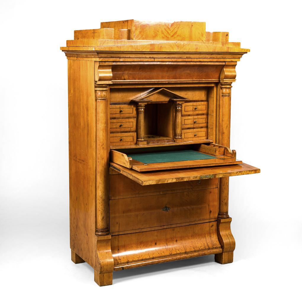 Schreibschrank mit aufklappbarer Schreibplatte und getrepptem Kopfteil mit seitlichen Volutenblenden und versteckten Schüben, kommodenförmiges Unterteil mit verstecktem Sockelschub; innen mit architektonisch verziertem Mittelfach, 6 kleinen Schüben, zahlreichen Geheimfächern und herausziehbarer Schreibplatte. Restauriert, Alters-/Gebrauchsspuren, Furnier mit Trockenrissen und kleinen Defekten.