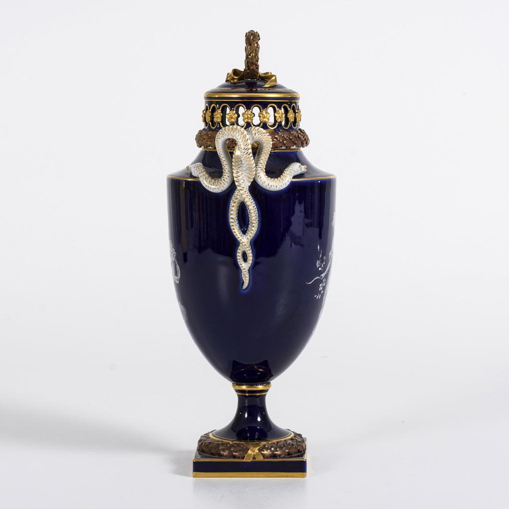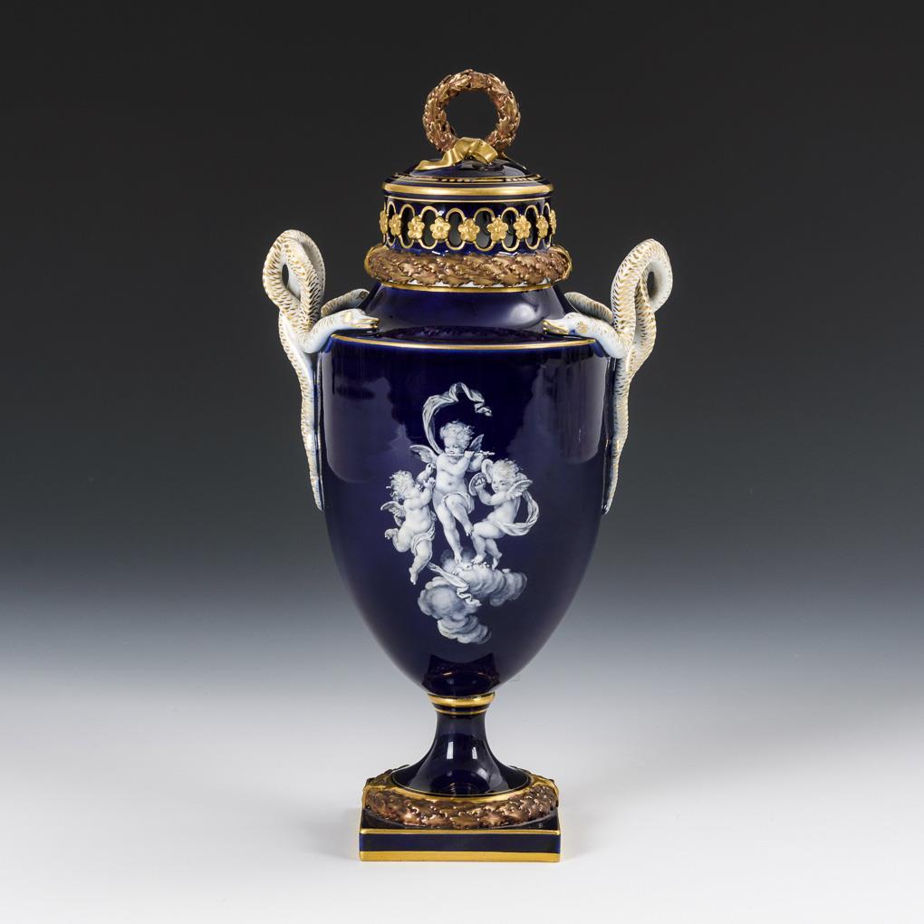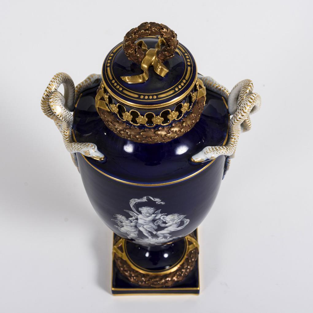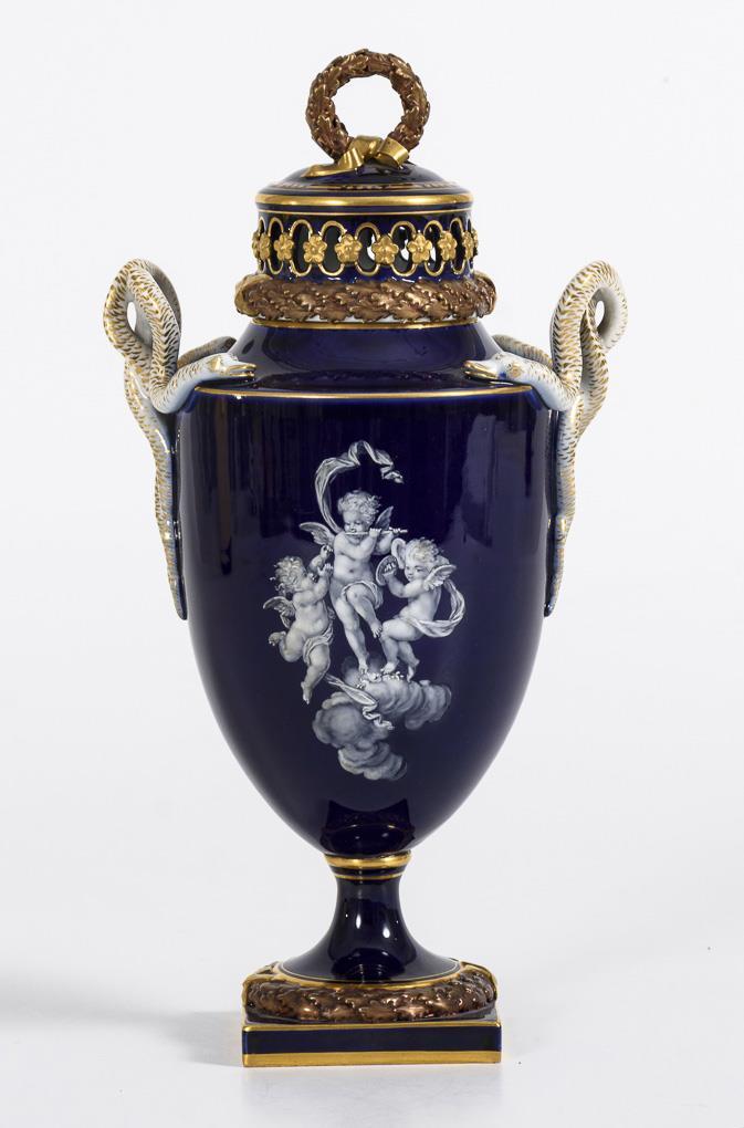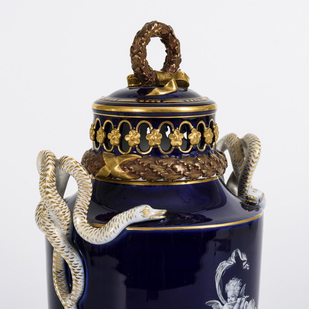 Ovoider Korpus mit zwei gewundenen Schlangenhenkeln sowie durchbrochenem Deckel mit Eichenlaubkranzknauf. Schauseitig die fein gemalte Darstellung der Venus mit Amorknaben, verso drei über einer Wolke stehende, musizierende Putten. Minimale Bestoßung an 1 Eichenblatt und 1 Sockelecke, 1 Teil eines Kreuzbandes am Fußkranz fehlt herstellungsbedingt.