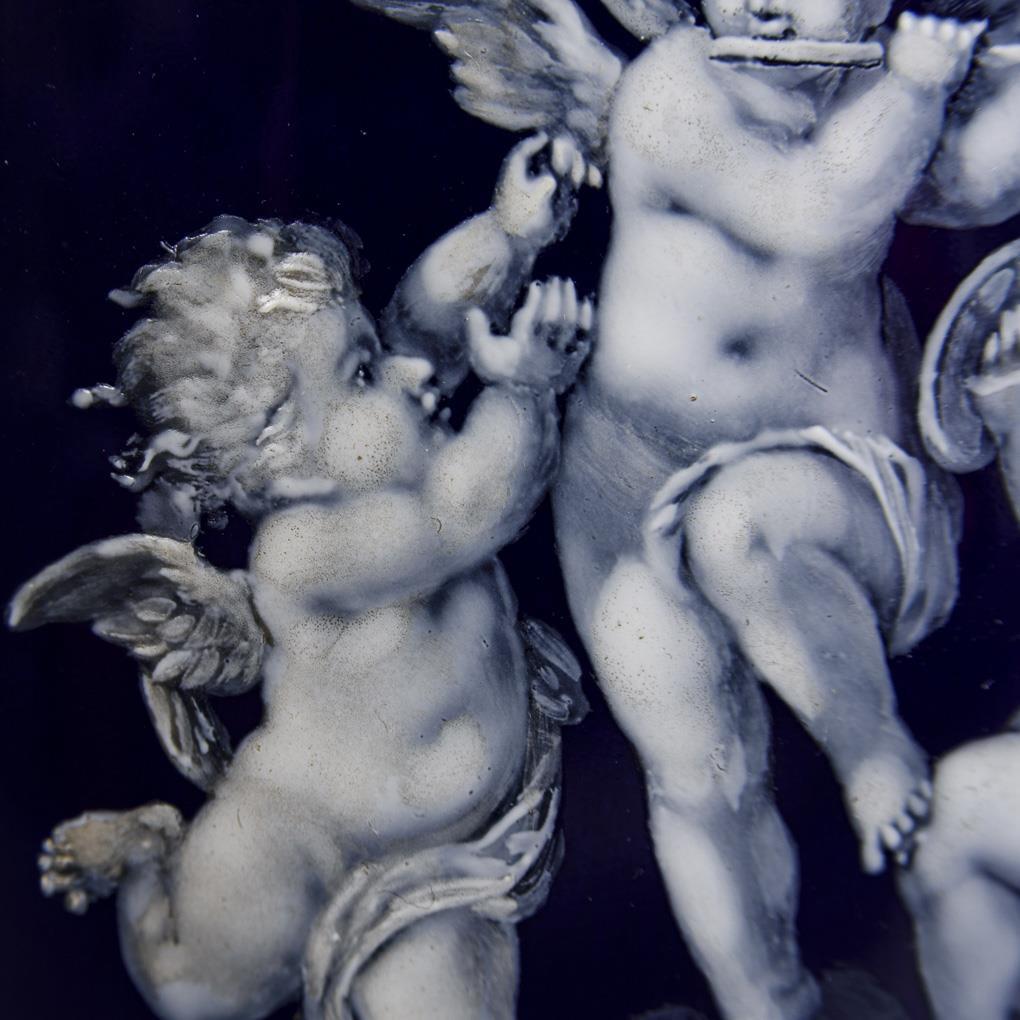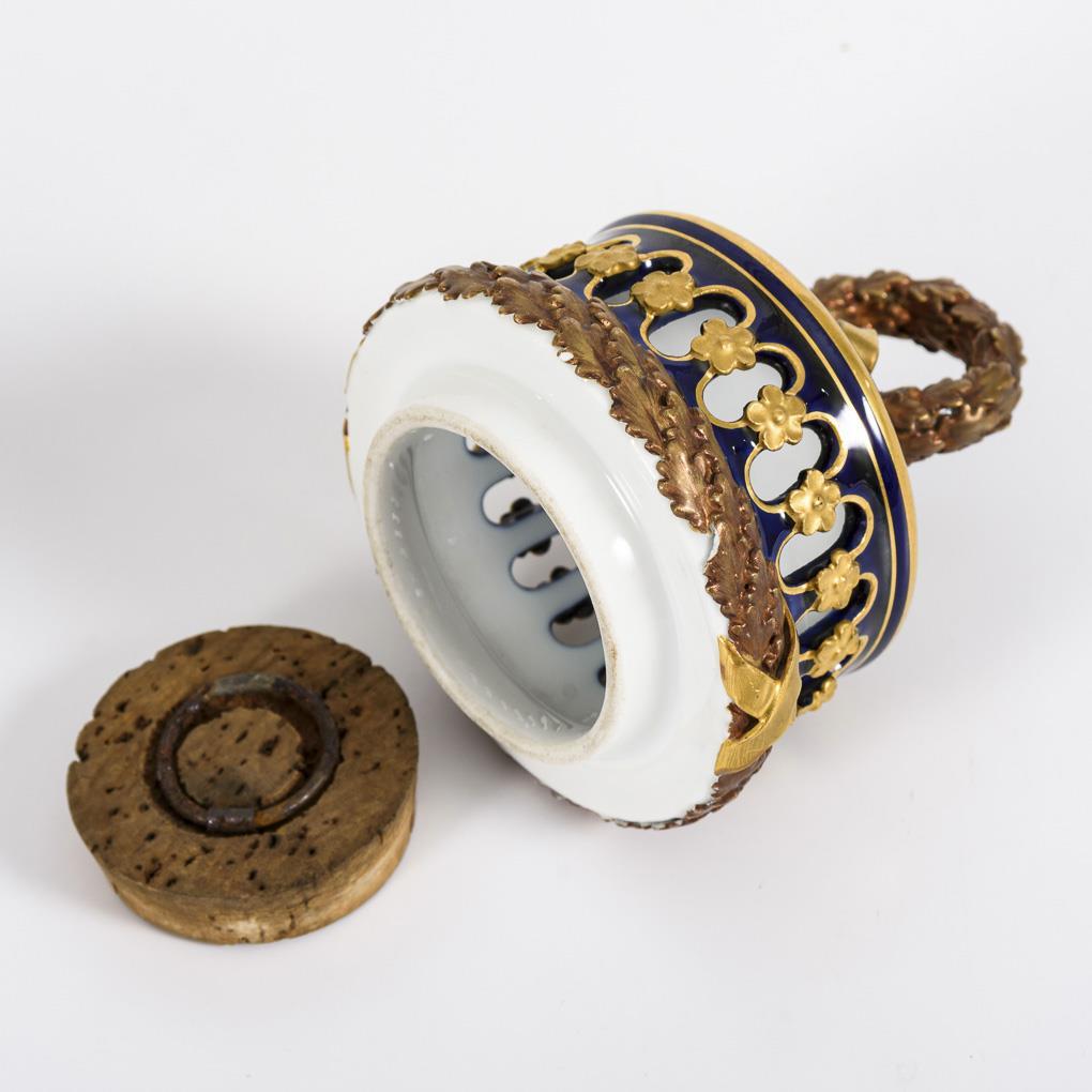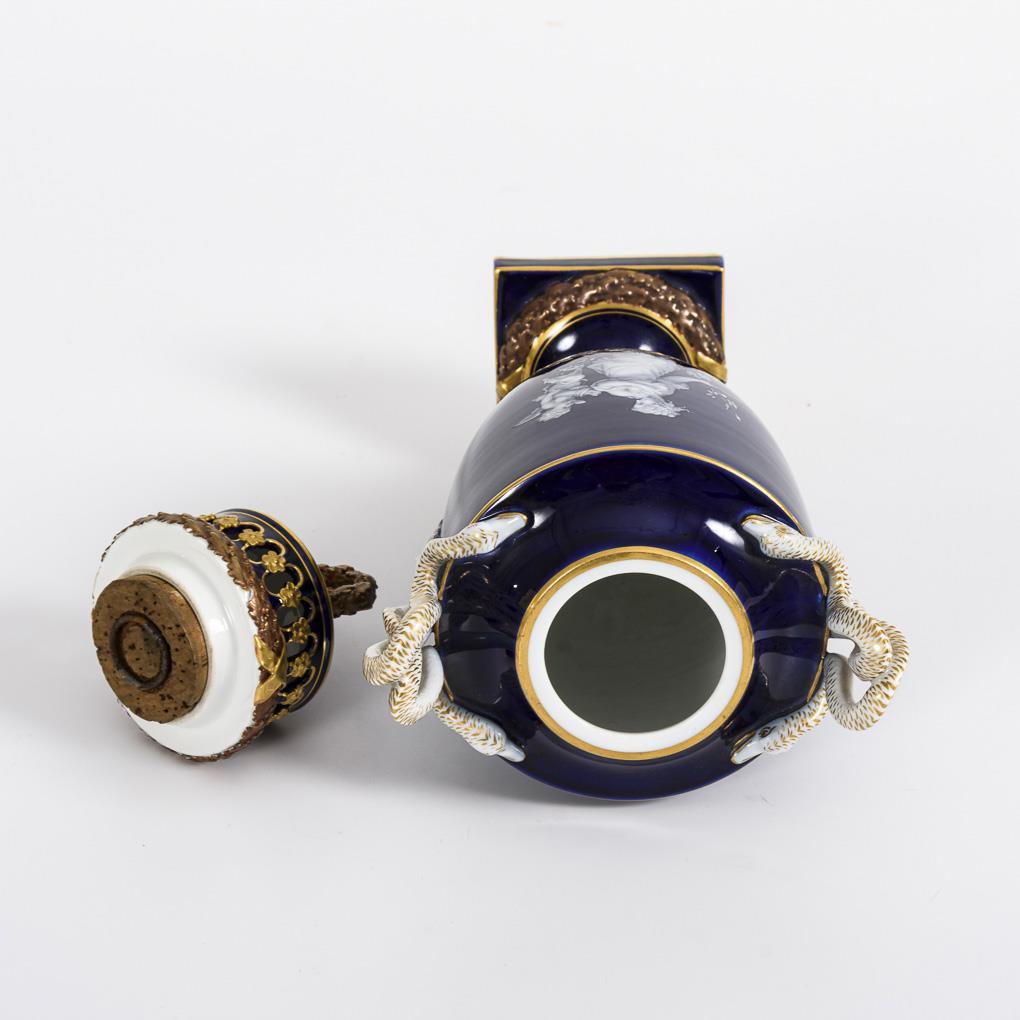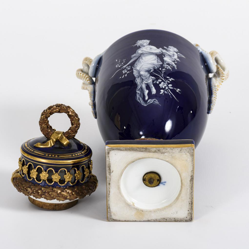 Ovoider Korpus mit zwei gewundenen Schlangenhenkeln sowie durchbrochenem Deckel mit Eichenlaubkranzknauf. Schauseitig die fein gemalte Darstellung der Venus mit Amorknaben, verso drei über einer Wolke stehende, musizierende Putten. Minimale Bestoßung an 1 Eichenblatt und 1 Sockelecke, 1 Teil eines Kreuzbandes am Fußkranz fehlt herstellungsbedingt.