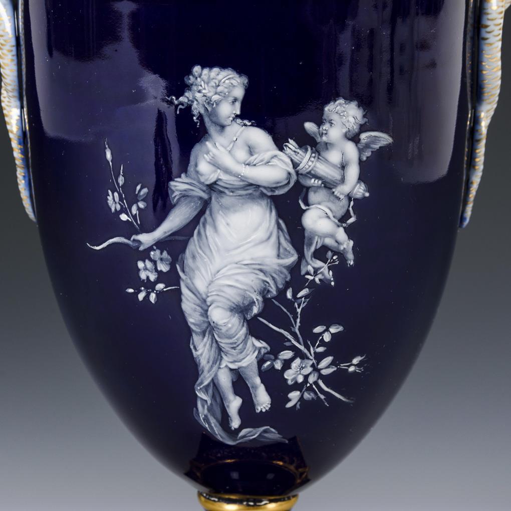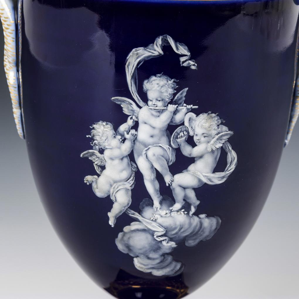 Kobaltblauer Fond, Pâte-sur-Pâte-Dekor, Goldstaffage. H 27,5 cm.