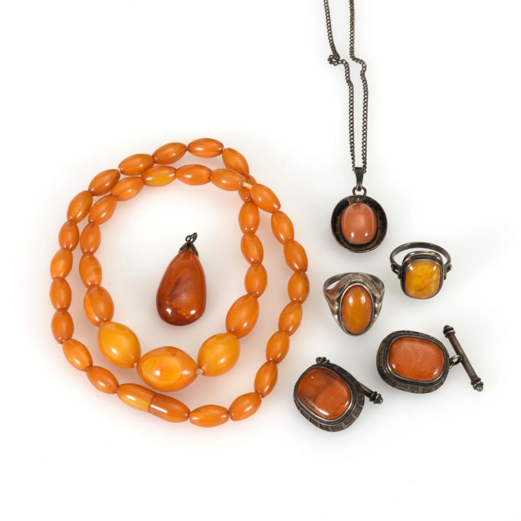 Halskette mit Bernsteinoliven an Schraubverschluss, 2 Anhänger, Manschettenknopfpaar und 2 Ringe mit Bernsteincabochons, Ankerkette mit Ringfederschließe.